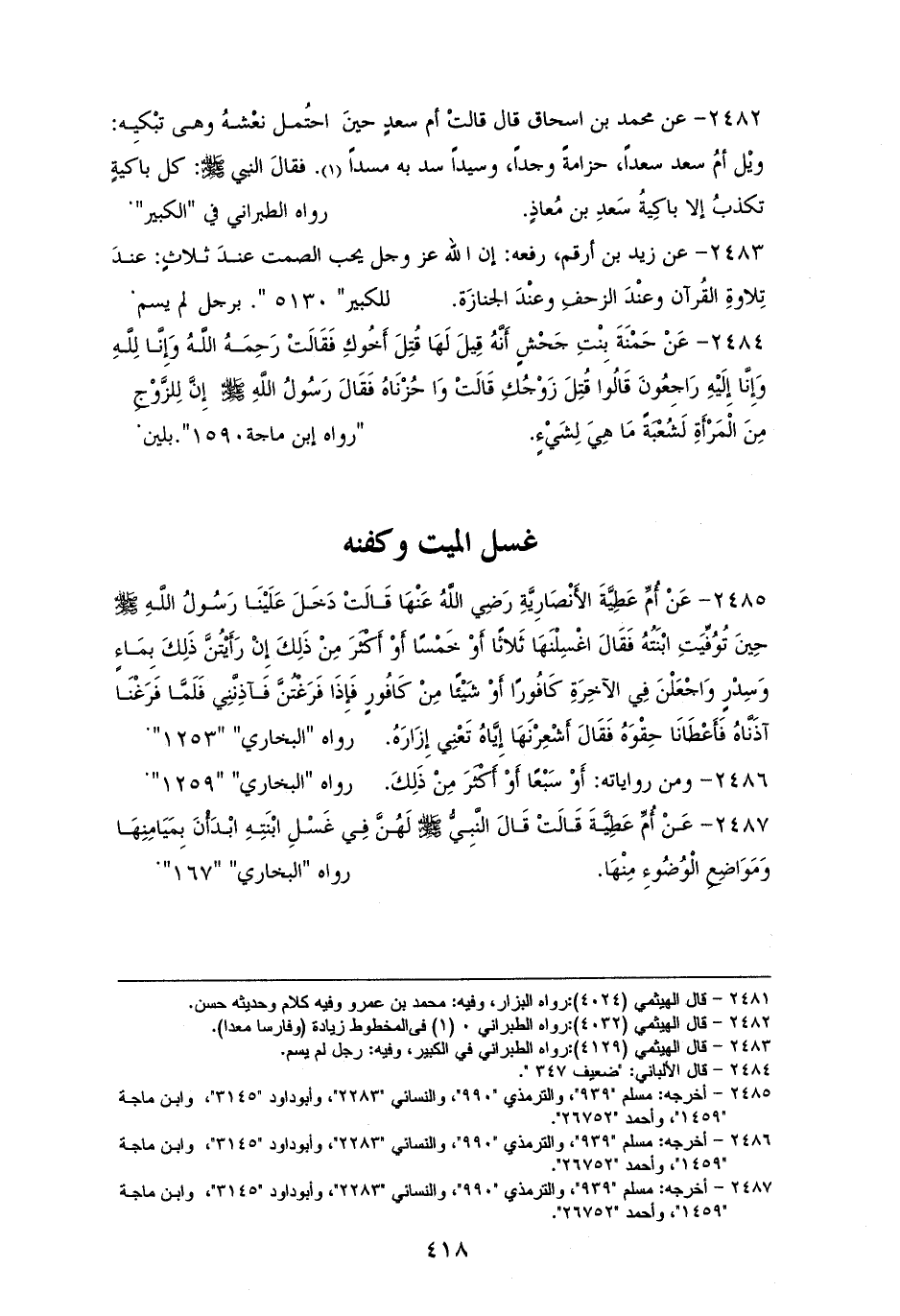2482 - ابنُ عباسٍ قال: قالت: أم سعد حين احتُمل نعشُهُ، وهي تبكيه: ويلُ أمِّ سعدٍ، سعداه حزامةًُ وجداه، فارسا معداه، سد به مسداه. فقال النبيُّ - صلى الله عليه وسلم -: ((كل باكيةٍ تكذبُ إلا باكية سعد بن معاذٍ)). ((للكبير)) بلين (¬1).