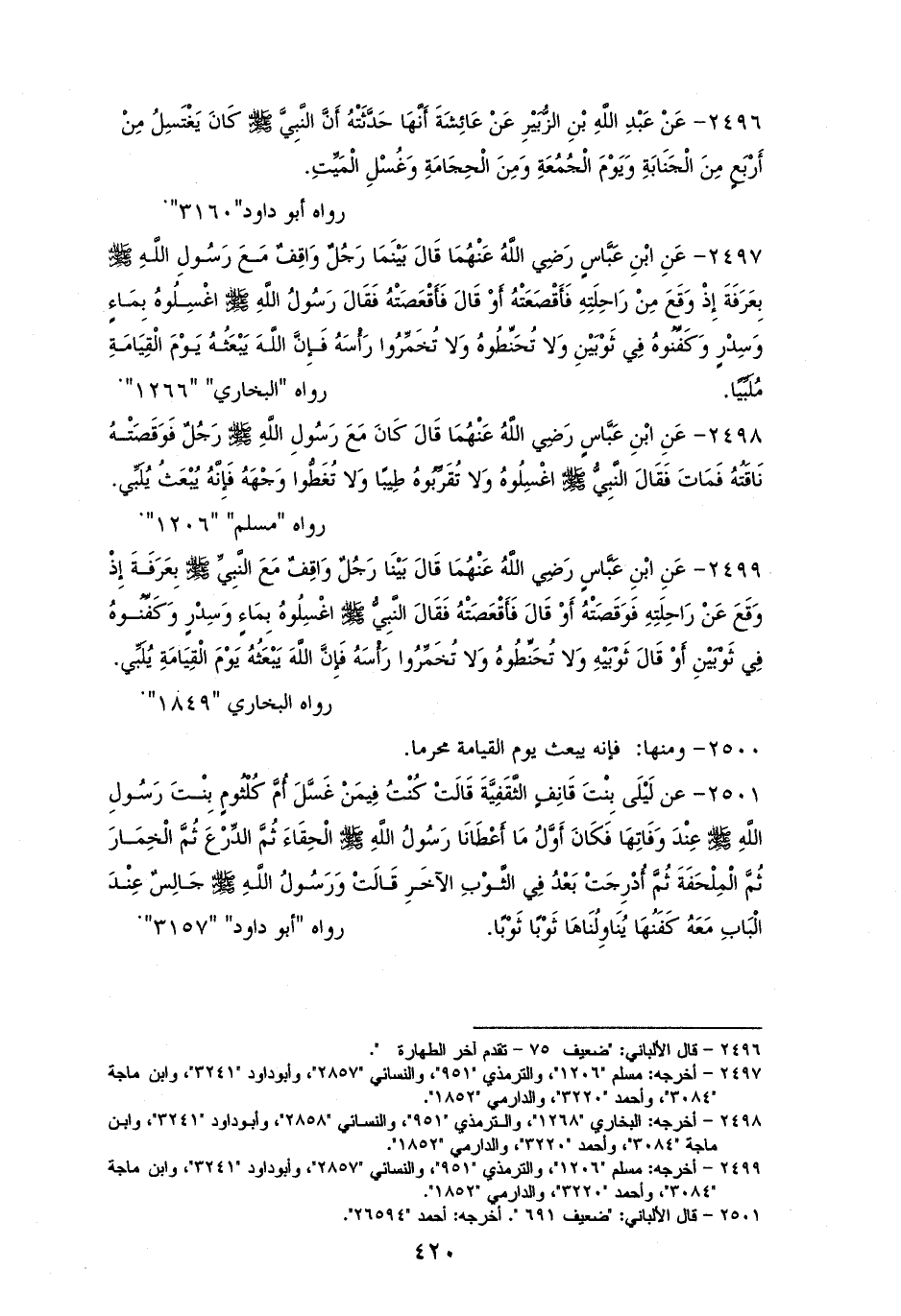 2498 - ومن رواياته: ((ولا تغطوا وجهه، ولا تقربوه طيبًا)) (¬1).