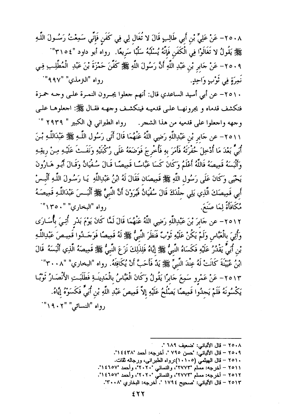 2509 - جابرُ: أنَّ النبي - صلى الله عليه وسلم - كفَّن حمزة في نمرةٍ في ثوبٍ واحدٍ. هما لأبي داود (¬1).