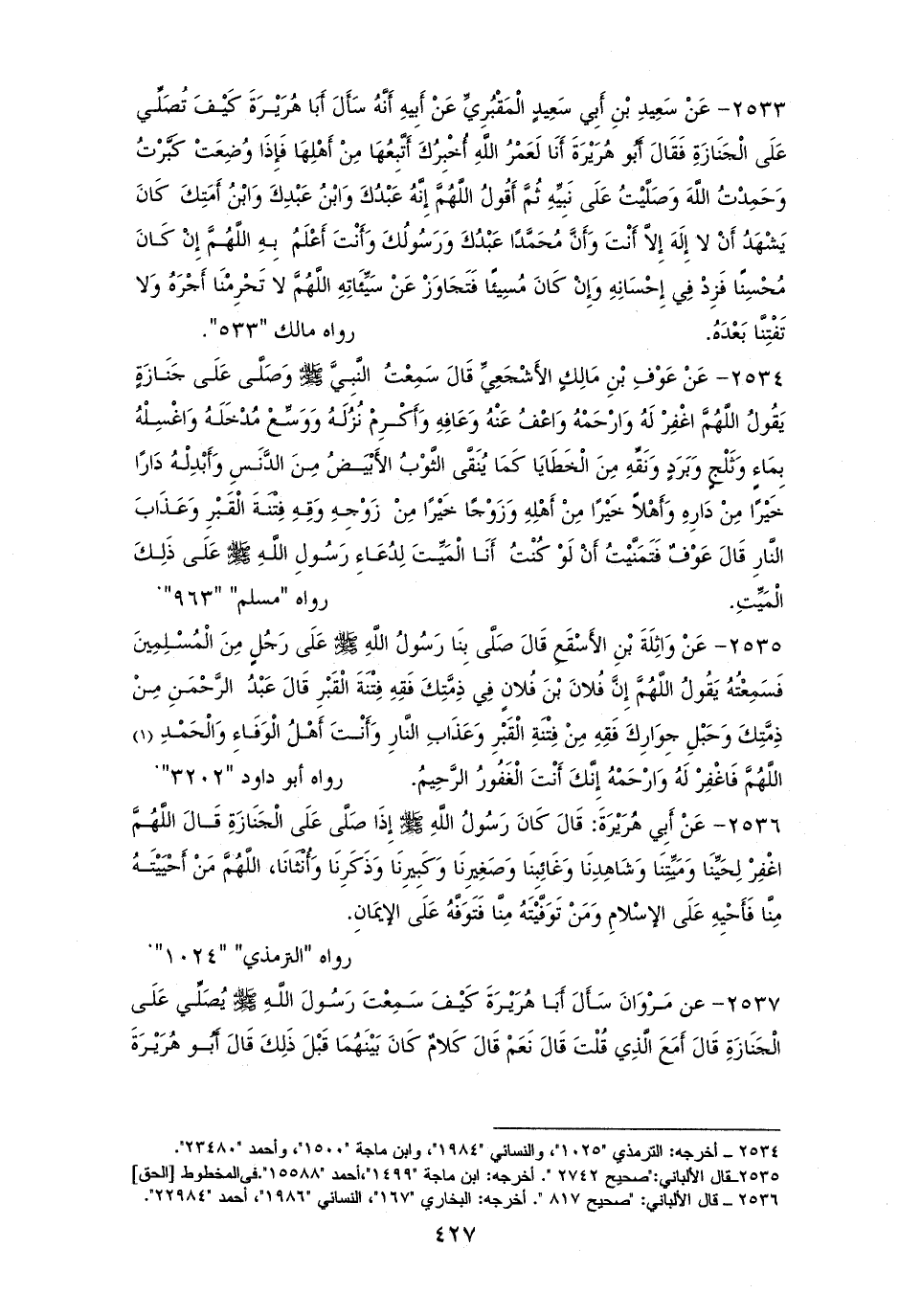 2536 - أَبو هُرَيْرَةَ: كَانَ رَسُولُ الله - صلى الله عليه وسلم - إِذَا صَلَّى عَلَى ْجَنَازَةِ قَالَ: ((اللهمَّ اغْفِرْ لِحَيِّنَا وَمَيِّتِنَا، وَشَاهِدِنَا وَغَائِبِنَا، وَصَغِيرِنَا وَكَبِيرِنَا، وَذَكَرِنَا وَأُنْثَانَا، اللهمَّ مَنْ أَحْيَيْتَهُ مِنَّا فَأَحْيِهِ عَلَى الإسْلامِ، وَمَنْ تَوَفَّيْتَهُ مِنَّا فَتَوَفَّهُ عَلَى الإيمَانِ)). للنسائي، والترمذي بلفظه (¬1).