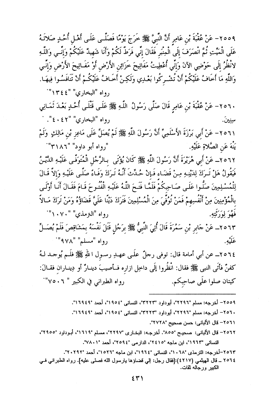 2563 - جَابِرُ بْنُ سَمُرَةَ: أُتِيَ النَّبِيُّ - صلى الله عليه وسلم - بِرَجُلٍ قَتَلَ نَفْسَهُ بِمَشَاقِصَ فَلَمْ يُصَلِّ عَلَيْهِ. لمسلم، والترمذي، والنسائي (¬1).