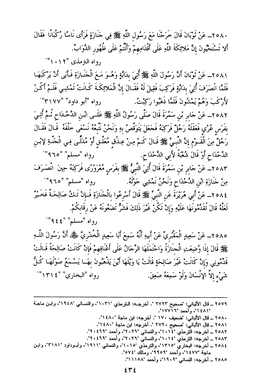 2580 - ثَوْبَانُ: خَرَجْنَا مَعَ النبي - صلى الله عليه وسلم - فِي جَنَازَةٍ فَرَأَى نَاسًا رُكْبَانًا، فَقَالَ: ((أَلا تَسْتَحْيُونَ أِنَّ مَلائِكَةَ الله عَلَى أَقْدَامِهِمْ، وَأَنْتُمْ عَلَى ظُهُورِ الدَّوَابِّ)). للترمذي (¬1).