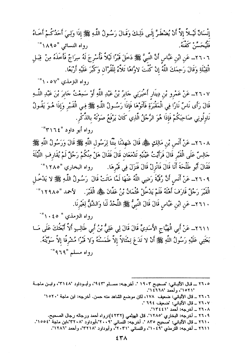 2611 - أَبو التياح الأَسَدِي: قَالَ لِي عَلِيُّ: أَلاَّ أَبْعَثُكَ عَلَى مَا بَعَثَنِي عَلَيْهِ رَسُولُ الله - صلى الله عليه وسلم -، اذهب فلا تَدَعَ تِمْثَالاً إِلاَّ طَمَسْتَهُ وَلا قَبْرًا مُشْرِفًا إِلاَّ سَوَّيْتَهُ. لمسلم، وأبي داود، والترمذي (¬1).