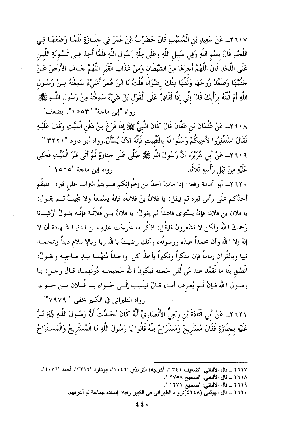 2617 - ابْنُ الْمُسَيَّبِ: حَضَرْتُ ابْنَ عُمَرَ فِي جِنَازَةٍ فَلَمَّا وَضَعَهَا فِي اللَّحْدِ، قَالَ: بِسْمِ الله، وَفِي سَبِيلِ الله، وَعَلَى مِلَّةِ رَسُولِ الله. فَلَمَّا أُخِذَ فِي تَسْوِيَةِ اللَّبِنِ عَلَى اللَّحْدِ قَالَ: اللهمَّ أَجِرْهَا مِنَ الشَّيْطَانِ وَمِنْ عَذَابِ الْقَبْرِ، اللهمَّ جَافِ الأَرْضَ عَنْ جَنْبَيْهَا، وَصَعِّدْ رُوحَهَا، وَلَقِّهَا مِنْكَ رِضْوَانًا قُلْتُ يَا ابْنَ عُمَرَ، أَشَيْءٌ سَمِعْتَهُ مِنْ رَسُولِ الله أَمْ قُلْتَهُ بِرَأْيِكَ؟ قَالَ: إِنِّي إِذًا لَقَادِرٌ عَلَى الْقَوْلِ، بَلْ سَمِعْتُهُ مِنْ رَسُولِ الله - صلى الله عليه وسلم -. للقزويني بضعف (¬1).