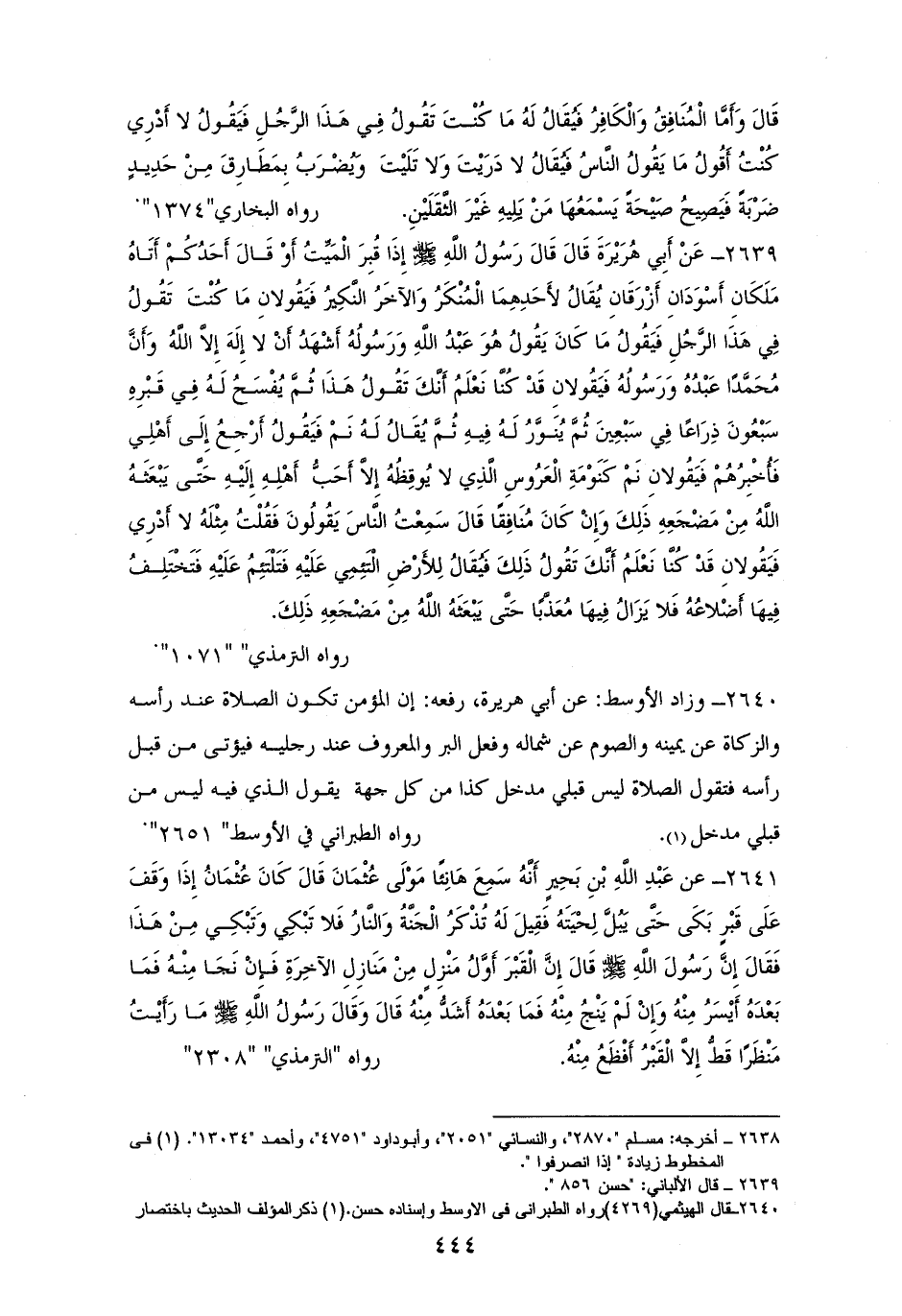 2639 - أَبو هُرَيْرَةَ رفعه: ((إِذَا قُبِرَ الْمَيِّتُ أَتَاهُ مَلَكَانِ أَسْوَدَانِ أَزْرَقَانِ يُقَالُ لأَحَدِهِمَا الْمُنْكَرُ، وَالآخَرُ النَّكِيرُ، فَيَقُولانِ: مَا كُنْتَ تَقُولُ فِي هَذَا الرَّجُلِ؟ فَيَقُولُ: مَا كَانَ يَقُولُ هُوَ عَبْدُ الله وَرَسُولُهُ، أَشْهَدُ أَنْ لا إِلَهَ إِلاَّ الله وَأَنَّ مُحَمَّدًا عَبْدُهُ وَرَسُولُهُ، فَيَقُولانِ: قَدْ كُنَّا نَعْلَمُ أَنَّكَ تَقُولُ هَذَا، ثُمَّ يُفْسَحُ لَهُ فِي قَبْرِهِ سَبْعُونَ ذِرَاعًا فِي سَبْعِينَ ثُمَّ يُنَوَّرُ لَهُ فِيهِ، ثُمَّ يُقَالُ لَهُ: نَمْ فَيَقُولُ: أَرْجِعُ إِلَى أَهْلِي فَأُخْبِرُهُمْ فَيَقُولانِ: نَمْ كَنَوْمَةِ الْعَرُوسِ الَّذِي لا يُوقِظُهُ إِلاَّ أَحَبُّ أَهْلِهِ إِلَيْهِ حَتَّى يَبْعَثَهُ الله مِنْ مَضْجَعِهِ ذَلِكَ، وَإِنْ كَانَ مُنَافِقًا، قَالَ: سَمِعْتُ النَّاسَ يَقُولُونَ قولا فَقُلْتُ مِثْلَهُ، لا أَدْرِي فَيَقُولانِ قَدْ كُنَّا نَعْلَمُ أَنَّكَ تَقُولُ ذَلِكَ فَيُقَالُ لِلأَرْضِ: الْتَئِمِي عَلَيْهِ، فَتَلْتَئِمُ عَلَيْهِ، فَتَخْتَلِفُ أَضْلاعُهُ فَلا يَزَالُ فِيهَا مُعَذَّبًا حَتَّى يَبْعَثَهُ الله مِنْ مَضْجَعِهِ ذَلِكَ)) (¬1).