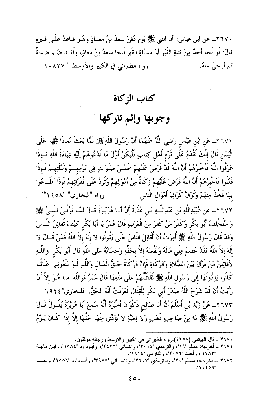 2671 - ابْنُ عَبَّاسٍ: أَنَّ رَسُولَ اللَّهِ - صلى الله عليه وسلم - لَمَّا بَعَثَ مُعَاذًا إلى الْيَمَنِ قَالَ: ((إِنَّكَ تَقْدُمُ عَلَى قَوْمٍ أَهْلِ كِتَابٍ، فَلْيَكُنْ أَوَّلَ مَا تَدْعُوهُمْ إِلَيْهِ عِبَادَةُ اللَّهِ، فَإِذَا عَرَفُوا، فَأَخْبِرْهُمْ أَنَّ اللَّهَ فَرَضَ عَلَيْهِمْ خَمْسَ صَلَوَاتٍ فِي يَوْمِهِمْ وَلَيْلَتِهِمْ، فَإِذَا فَعَلُوا فَأَخْبِرْهُمْ أَنَّ اللَّهَ فَرَضَ عَلَيْهِمْ زَكَاةً تؤخذ مِنْ أَمْوَالِهِمْ، وَتُرَدُّ عَلَى فُقَرَائِهِمْ، فَإِذَا أَطَاعُوا بِهَا فَخُذْ مِنْهُمْ وَتَوَقَّ كَرَائِمَ أَمْوَالِهم. واتقِ دعوة المظلوم، فإنه ليس بينه وبين الله حجاب)). للستة إلا مالكًا (¬1).