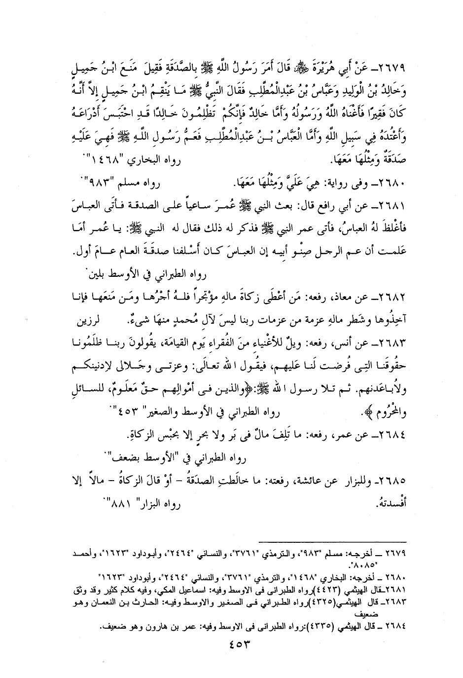 2684 - عمر رفعه: ((ما تُلِفَ مالٌ فى بَر ولا بحرٍ إلا بحبْس الزكاةِ)). ((للأوسط)) بضعف (¬1).
