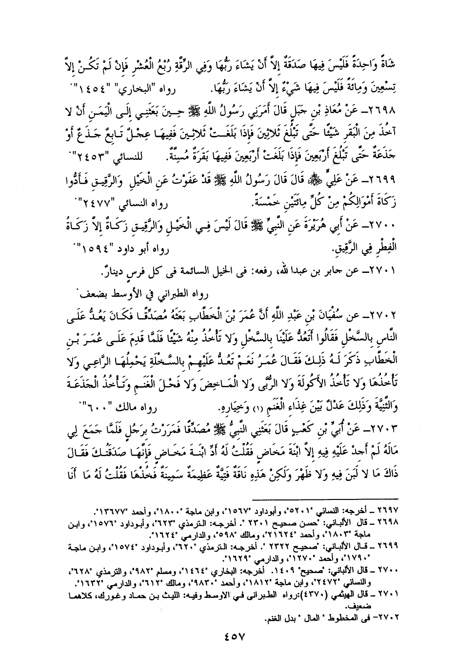 2699 - عَلِيٌ رفعه: ((قَدْ عَفَوْتُ عَنِ الْخَيْلِ وَالرَّقِيقِ، فَأَدُّوا زَكَاةَ أَمْوَالِكُمْ مِنْ كُلِّ مِائَتَيْنِ خَمْسَةً)). هما لأصحاب السنن بلفظ النسائي (¬1).
