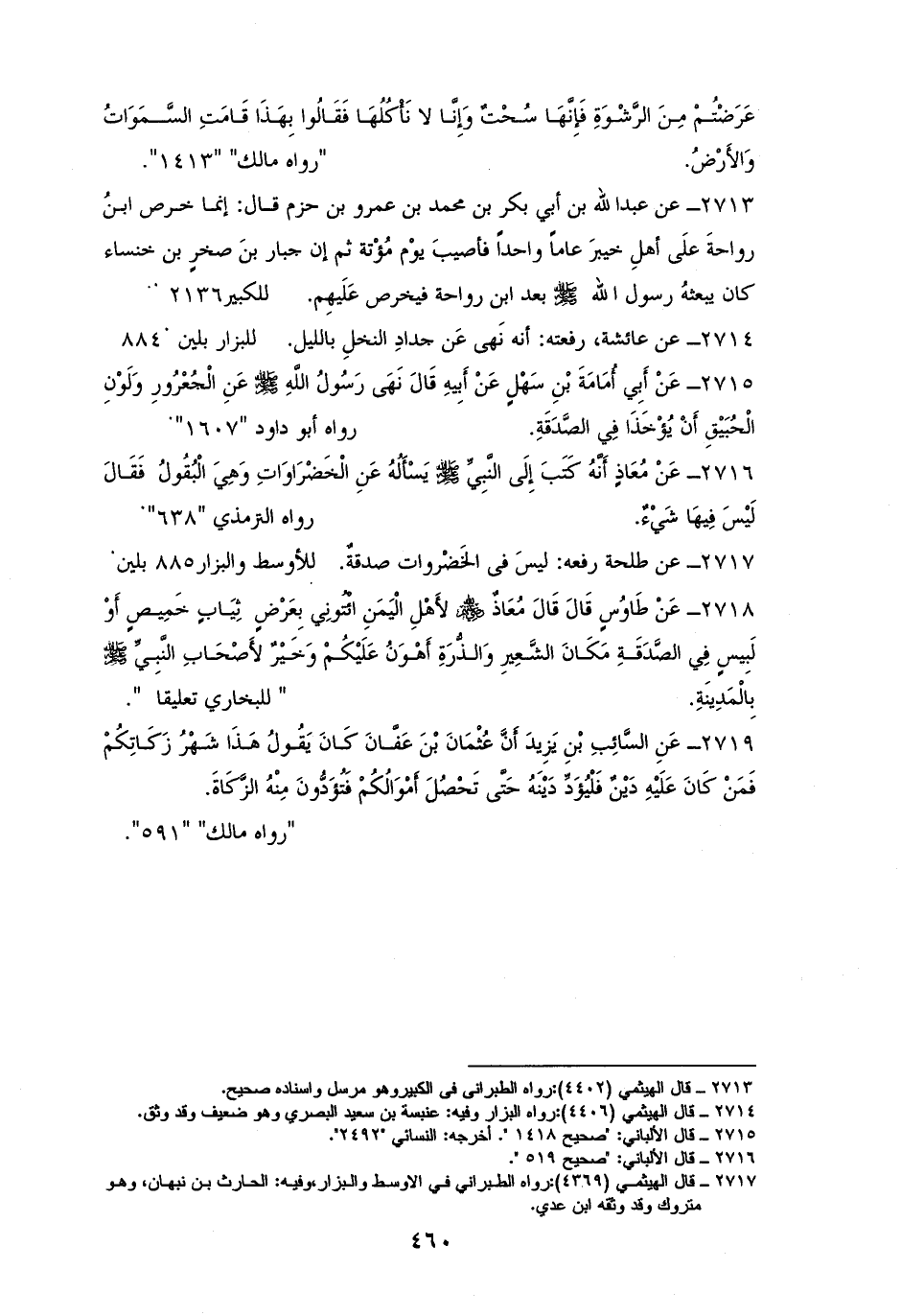 2717 - طلحةُ رفعه: ((ليسَ فى الخُضْروات صدقةٌ)). ((للأوسط))، والبزار بلين (¬1).
