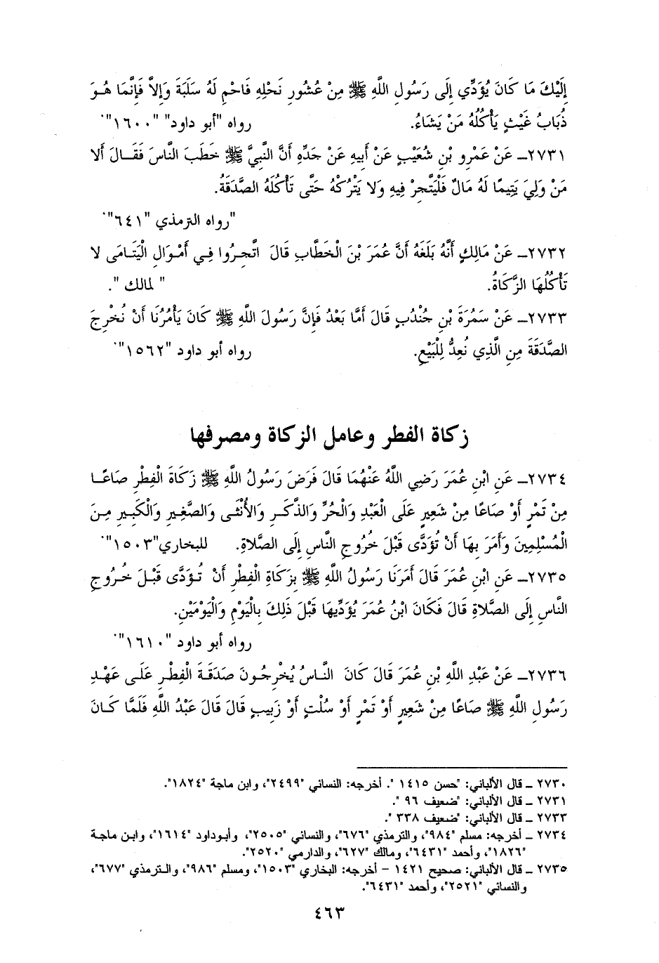 2734 - ابْنُ عُمَرَ: فَرَضَ رَسُولُ اللَّهِ - صلى الله عليه وسلم - زَكَاةَ الْفِطْرِ صَاعًا مِنْ تَمْرٍ، أَوْ صَاعًا مِنْ شَعِيرٍ عَلَى الْعَبْدِ وَالْحُرِّ، وَالذَّكَرِ، وَالأُنْثَى، وَالصَّغِيرِ، وَالْكَبِيرِ مِنَ الْمُسْلِمِينَ وأَنْ تُؤَدَّى قَبْلَ خُرُوجِ النَّاسِ إِلَى المصلى. للستة بلفظ البخاري (¬1).