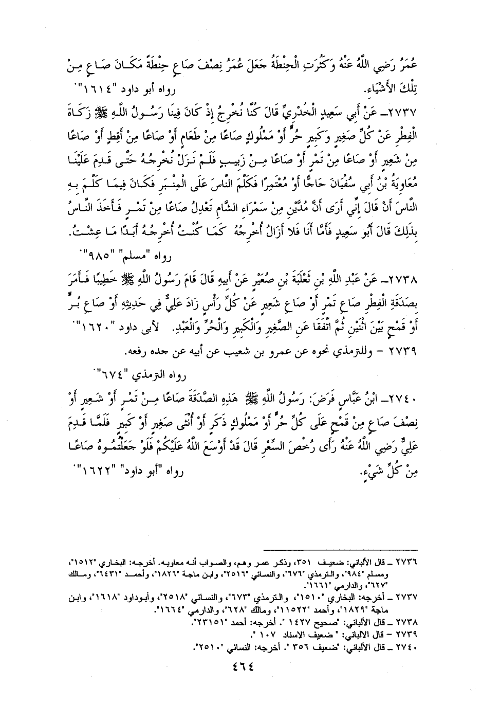 2740 - ابْنُ عَبَّاسٍ: فَرَضَ رَسُولُ اللَّهِ - صلى الله عليه وسلم - هَذِهِ الصَّدَقَةَ صَاعًا مِنْ تَمْرٍ، أَوْ صاعًا من شَعِيرٍ، أَوْ نِصْفَ صَاعٍ مِنْ قَمْحٍ عَلَى كُلِّ حُرٍّ، أَوْ مَمْلُوكٍ، ذَكَرٍ، أَوْ أُنْثَى، صَغِيرٍ أَوْ كَبِيرٍ، فَلَمَّا قَدِمَ عَلِيٌّ رَأَى رُخْصَ السِّعْرِ فقَالَ قَدْ أَوْسَعَ اللَّهُ عَلَيْكُمْ، فَلَوْ جَعَلْتُمُوهُا صَاعًا مِنْ كُلِّ شَيْءٍ. للنسائي، وأبي داود بلفظه (¬1).