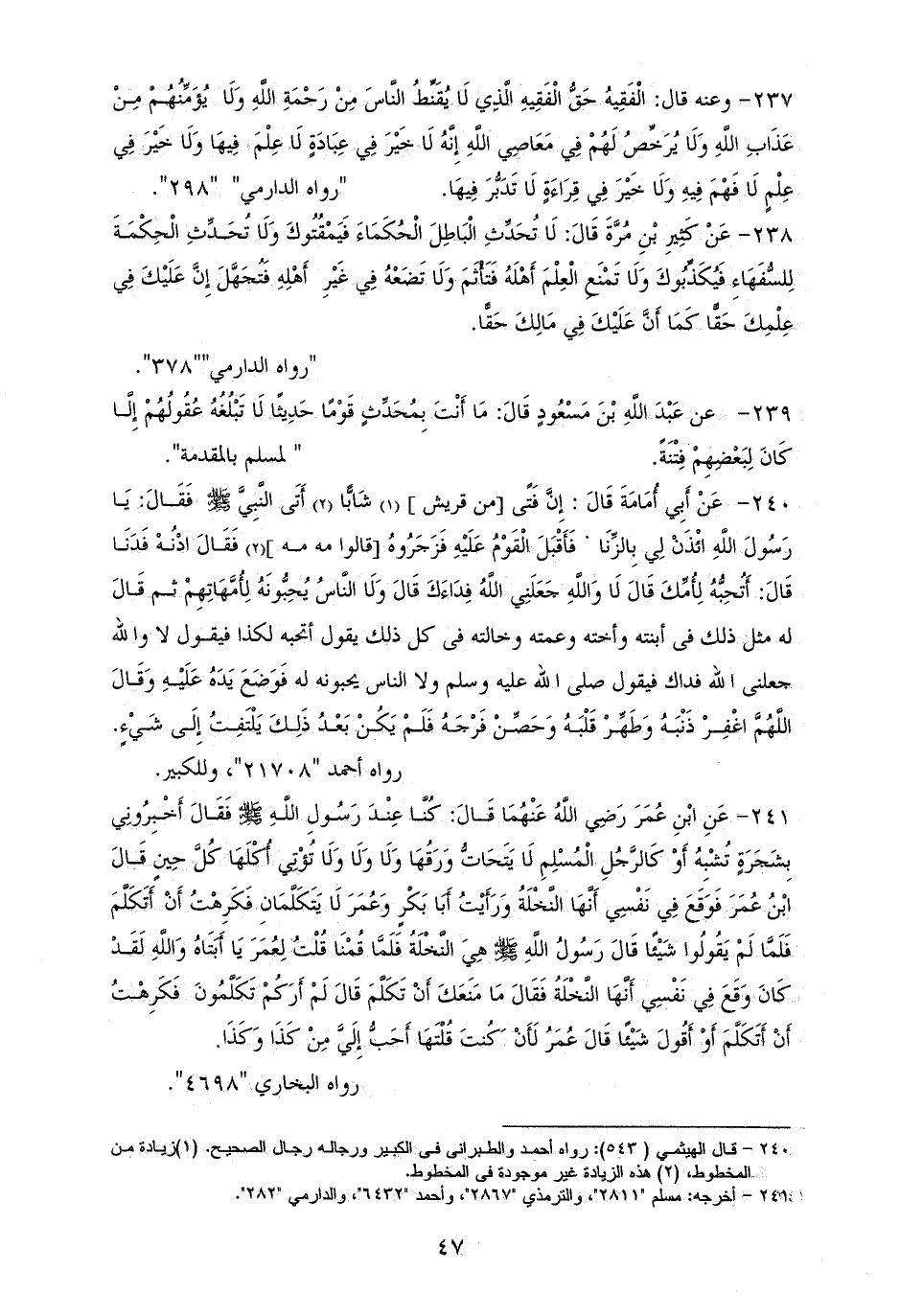238 - كَثِيرِ بْنِ مُرَّةَ قَالَ: لَا تُحَدِّثِ الْبَاطِلَ للحُكَمَاءَ فَيَمْقُتُوكَ، وَلَا تُحَدِّثِ الْحِكْمَةَ لِلسُّفَهَاءِ فَيُكَذِّبُوكَ، وَلَا تَمْنَعِ الْعِلْمَ أَهْلَهُ فَتَأْثَمَ، وَلَا تَضَعْهُ فِي غَيْرِ أَهْلِهِ فَتُجَهَّلَ، إِنَّ عَلَيْكَ فِي عِلْمِكَ حَقًّا كَمَا أَنَّ عَلَيْكَ فِي مَالِكَ حَقًّا. هما للدارمي (¬1).