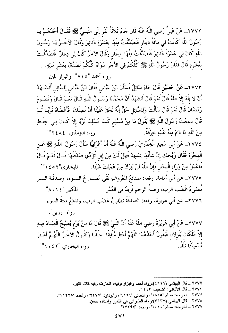 2772 - عَلِيٌّ: جَاءَ ثَلاثَةُ نَفَرٍ إِلَى النَّبِيِّ - صلى الله عليه وسلم -، فَقَالَ: أَحَدُهُمْ كَانَتْ لِي مِائَةُ دِينَارٍ، فَتَصَدَّقْتُ مِنْهَا بِعَشَرَةِ. وَقَالَ آخَرُ: كانت لِي عَشَرَةُ، فَتَصَدَّقْتُ بواحدة. وَقَالَ الآخَرُ: كَانَ لِي دِينَارٌ، فَتَصَدَّقْتُ بِعُشْرِهِ. فَقَالَ - صلى الله عليه وسلم -: ((كُلُّكُمْ فِي الأَجْرِ سَوَاءٌ، كُلُّكُمْ تَصَدَّقَ بِعُشْرِ مَالِهِ)). لأحمد، والبزار، بلين (¬1).