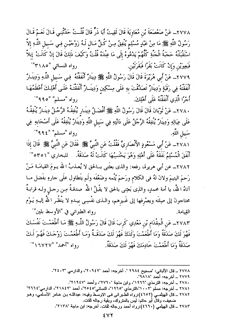 2780 - ثَوْبَانُ رفعه: ((أَفْضَلُ دِينَارٍ يُنْفِقُهُ الرَّجُلُ دِينَارٌ يُنْفِقُهُ عَلَى عِيَالِهِ، وَدِينَارٌ يُنْفِقُهُ عَلَى دَابَّتِهِ فِي سَبِيلِ اللَّهِ، وَدِينَارٌ يُنْفِقُهُ عَلَى أَصْحَابِهِ فِي سَبِيلِ اللَّهِ)). لمسلم، والترمذي (¬1).