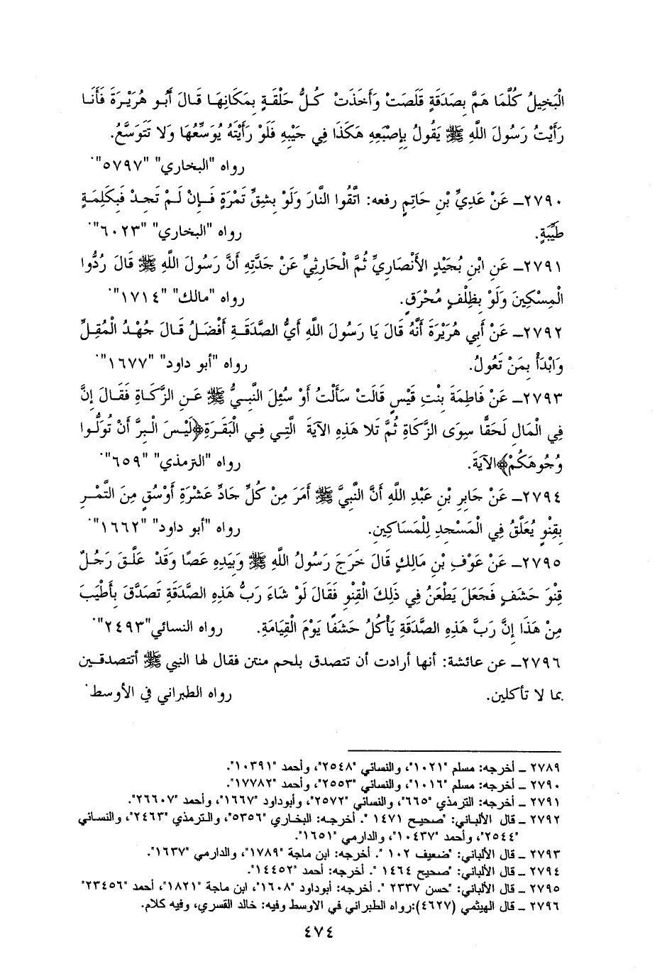 2790 - عَدِيُّ بْنِ حَاتِمٍ رفعه: ((اتَّقُوا النَّارَ وَلَوْ بِشِقِّ تَمْرَةٍ فَإِنْ لَمْ تَجِدْ فَبِكَلِمَةٍ طَيِّبَةٍ)). هما للشيخين، والنسائي (¬1).