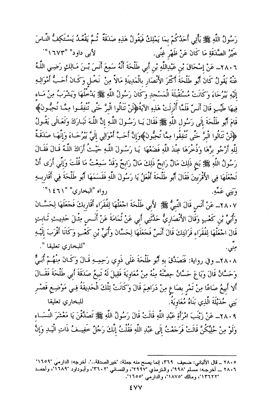 2808 - وفي أخرى: فَتَصَدَّقَ بِهِ أَبُو طَلْحَةَ عَلَى ذَوِي رَحِمِهِ، وَكَانَ مِنْهُمْ أُبَيٌّ وَحَسَّانُ، فبَاعَ حَسَّانُ حِصَّتَهُ مِنْ مُعَاوِيَةَ، فَقِيلَ لَهُ: تَبِيعُ صَدَقَةَ أَبِي طَلْحَةَ؟! قَالَ: لا أَبِيعُ صَاعًا مِنْ تَمْرٍ بِصَاعٍ مِنْ دَرَاهِمَ. وَكَانَتْ تِلْكَ الْحَدِيقَةُ فِي مَوْضِعِ قَصْرِ بَنِي حُدَيْلَةَ الَّذِي بَنَاهُ مُعَاوِيَةُ (¬1).