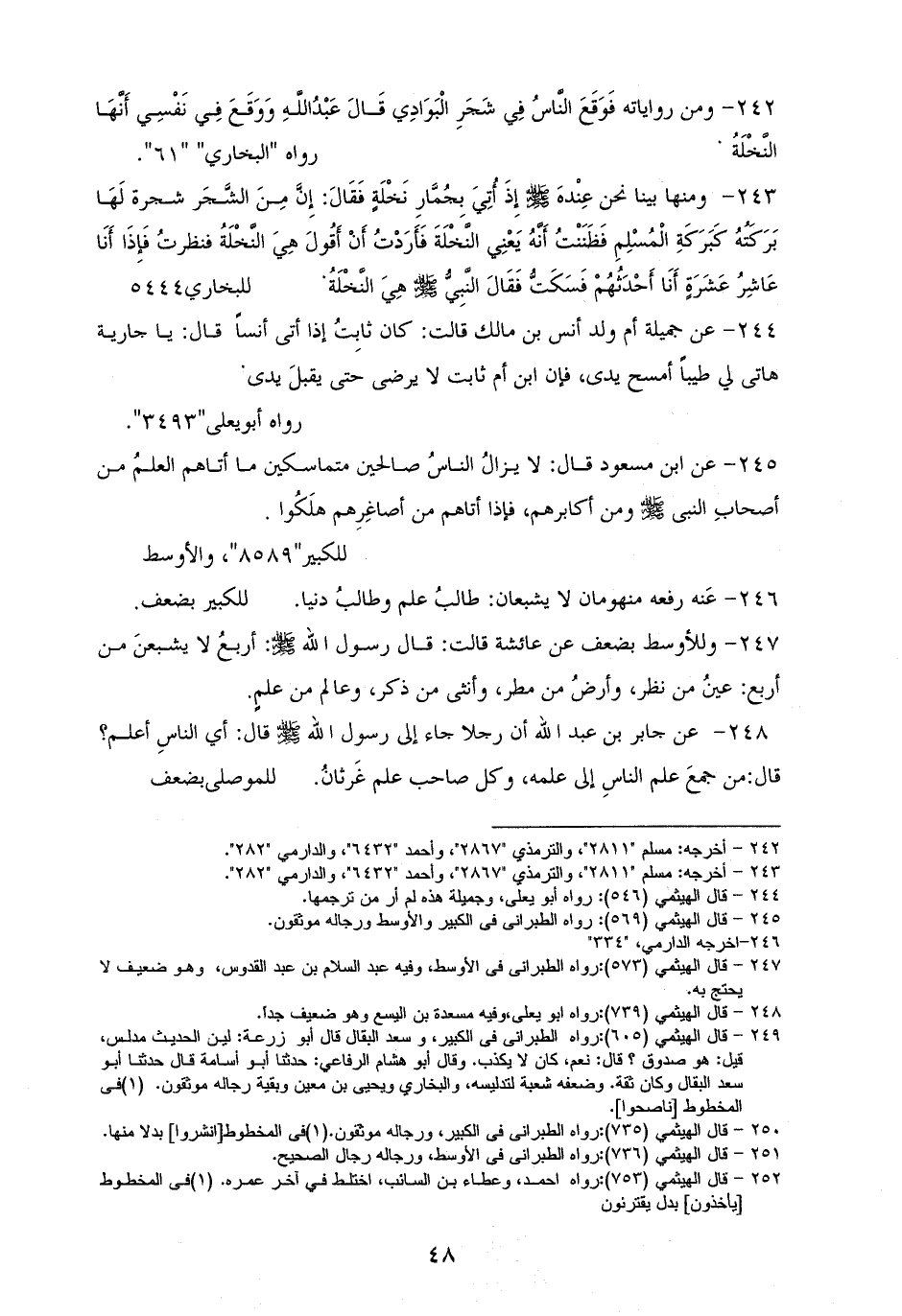 248 - جابر: قال رجل: يا رسول الله: أي الناسِ أعلم؟ قال: من جمعَ علم الناسِ إلى علمه، كل صاحب علم غَرثانُ. للموصلى بضعف (¬1).