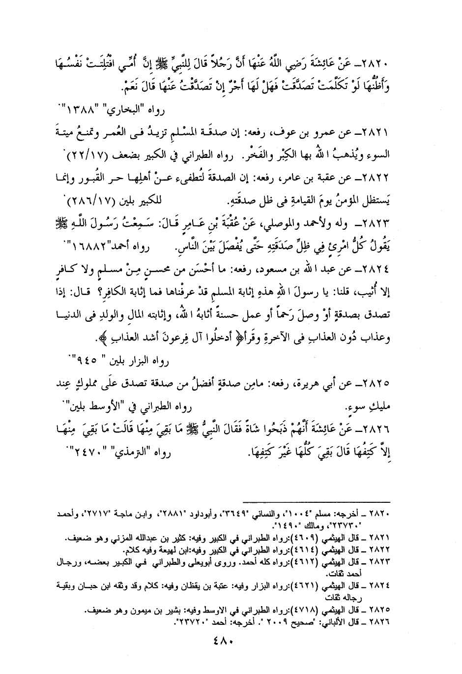 2821 - عمروُ بنُ عوف رفعه: ((إن صدقَة المسْلمِ تزيدُ فى العُمر، وتمنعُ ميتةَ السوء، ويُذهبُ اللهُ بها الكِبْر والفَخْر)). ((للكبير)) بضعف (¬1).