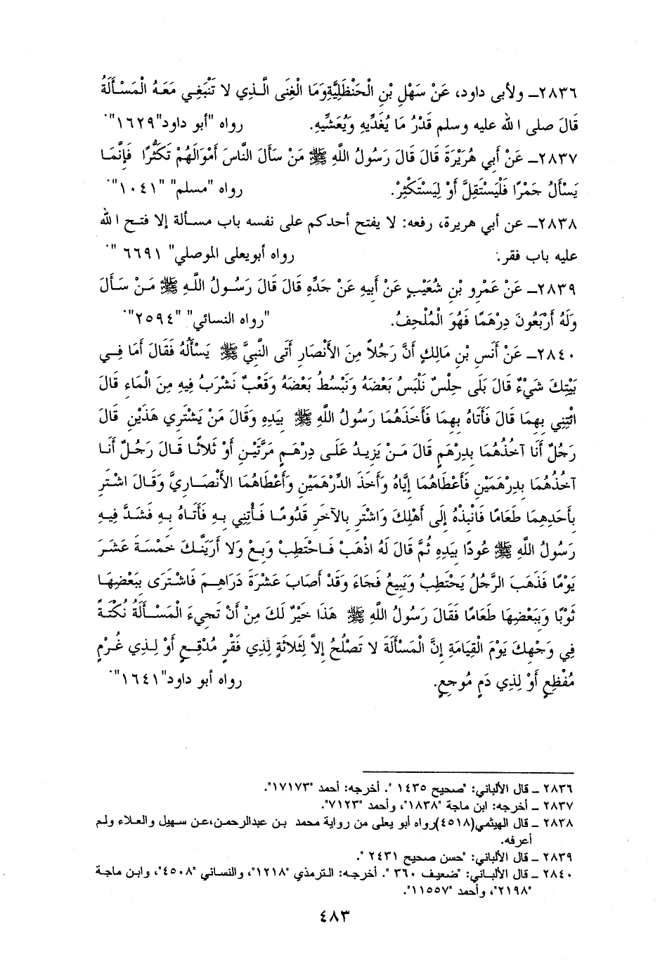 2839 - ابنُ عَمْرِو بْنُ العاص رفعه: ((مَنْ سَأَلَ وَلَهُ أَرْبَعُونَ دِرْهَمًا فَهُوَ مُلْحِفٌ)). للنسائي (¬1).