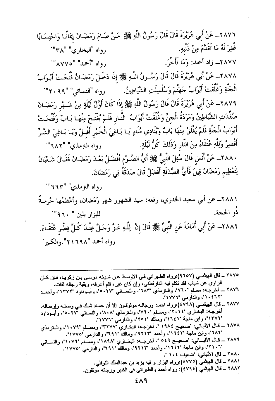 2878 - وعنه رفعه: ((إِذَا دَخَلَ رَمَضَانُ فُتِّحَتْ أَبْوَابُ الْجَنَّةِ، وَأغُلِّقَتْ أَبْوَابُ جَهَنَّمَ، وَسُلْسِلَتِ الشَّيَاطِينُ)). للشيخين، و ((الموطأ))،والنسائيِّ (¬1).