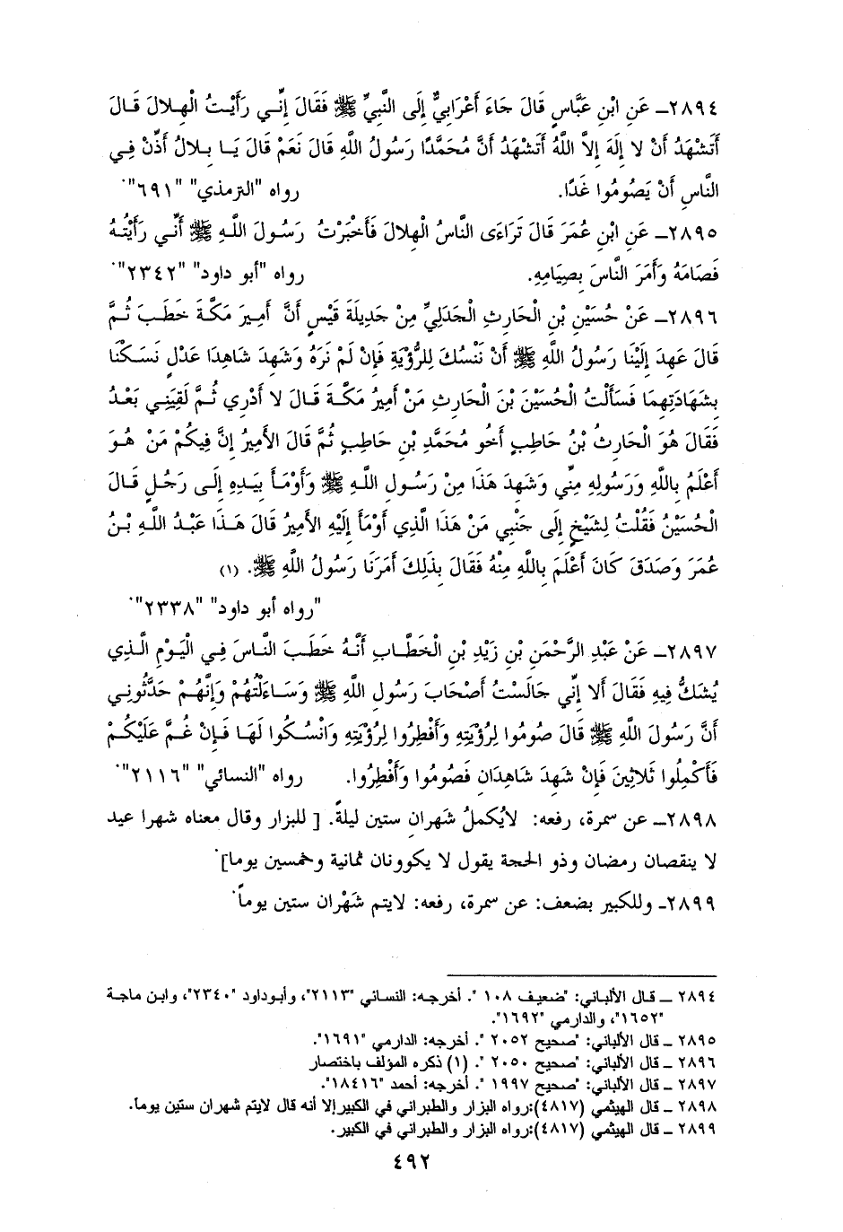 2894 - ابْنُ عَبَّاسٍ جَاءَ أَعْرَابِيٌّ إِلَى النَّبِيِّ - صلى الله عليه وسلم - فَقَالَ: إِنِّي رَأَيْتُ الْهِلالَ، فقَالَ: ((أَتَشْهَدُ أَنْ لا إِلَهَ إِلاَّ اللَّهُ؟)) قال: نعم قال: ((أَتَشْهَدُ أَنَّ مُحَمَّدًا رَسُولُ اللَّهِ)). قَالَ نَعَمْ. قَالَ: ((يَا بِلالُ أَذِّنْ فِي النَّاسِ أَنْ يَصُومُوا غَدًا)). لأصحاب السنن (¬1).
