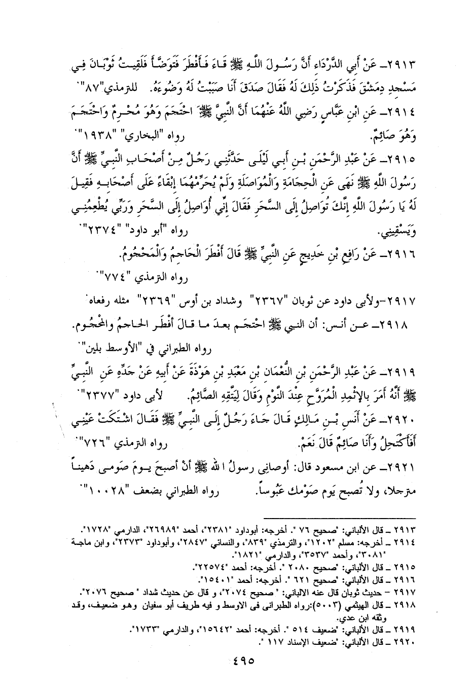 2918 - أنسُ: أنَّ النبيَّ - صلى الله عليه وسلم - احْتجَم بعدَ ما قالَ: ((أفْطَر الحاجمُ والمحْجُوم)). للأوسطِ بلينٍ (¬1).