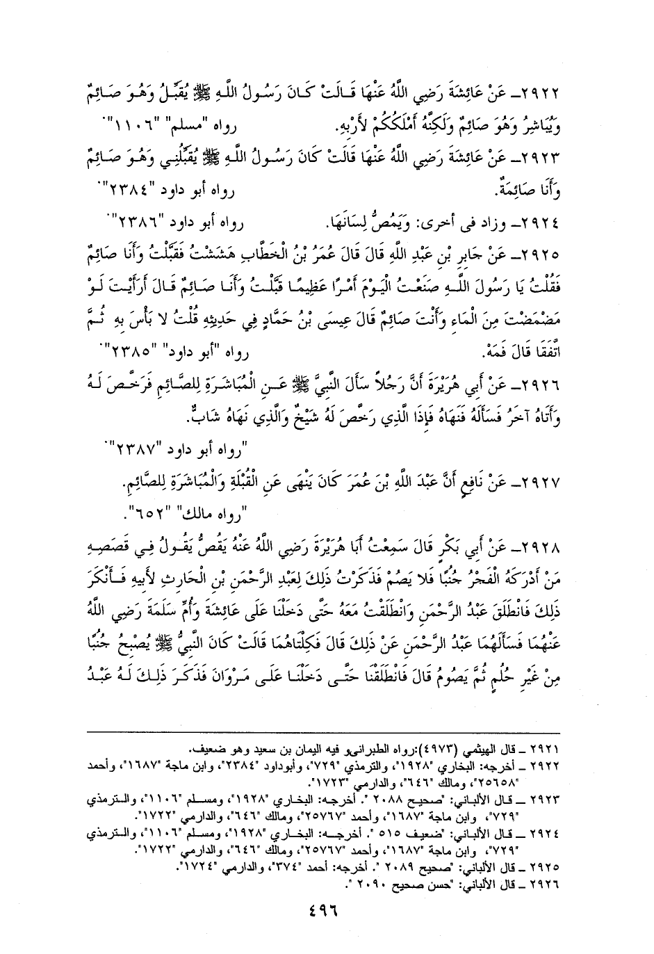 2922 - عَائِشَةُ: كَانَ رَسُولُ اللَّهِ - صلى الله عليه وسلم - يُقَبِّلُ وَيُبَاشِرُ وَهُوَ صَائِمٌ، وكانَ أملَكَكُمْ لإرْبِهِ. الستةِ إلا أبا داودَ (¬1).
