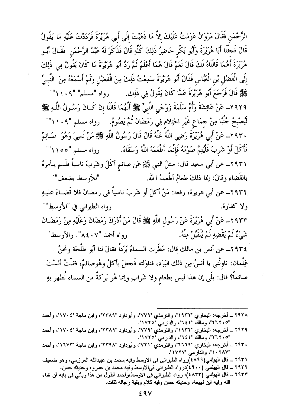2930 - أبو هُرَيْرَةَ رفعه: ((مَنْ نَسِيَ وَهُوَ صَائِمٌ فَأَكَلَ أَوْ شَرِبَ فَلْيُتِمَّ صَوْمَهُ، فَإِنَّمَا أَطْعَمَهُ اللَّهُ وَسَقَاهُ)). للشيخين وأبي داود والترمذي (¬1).
