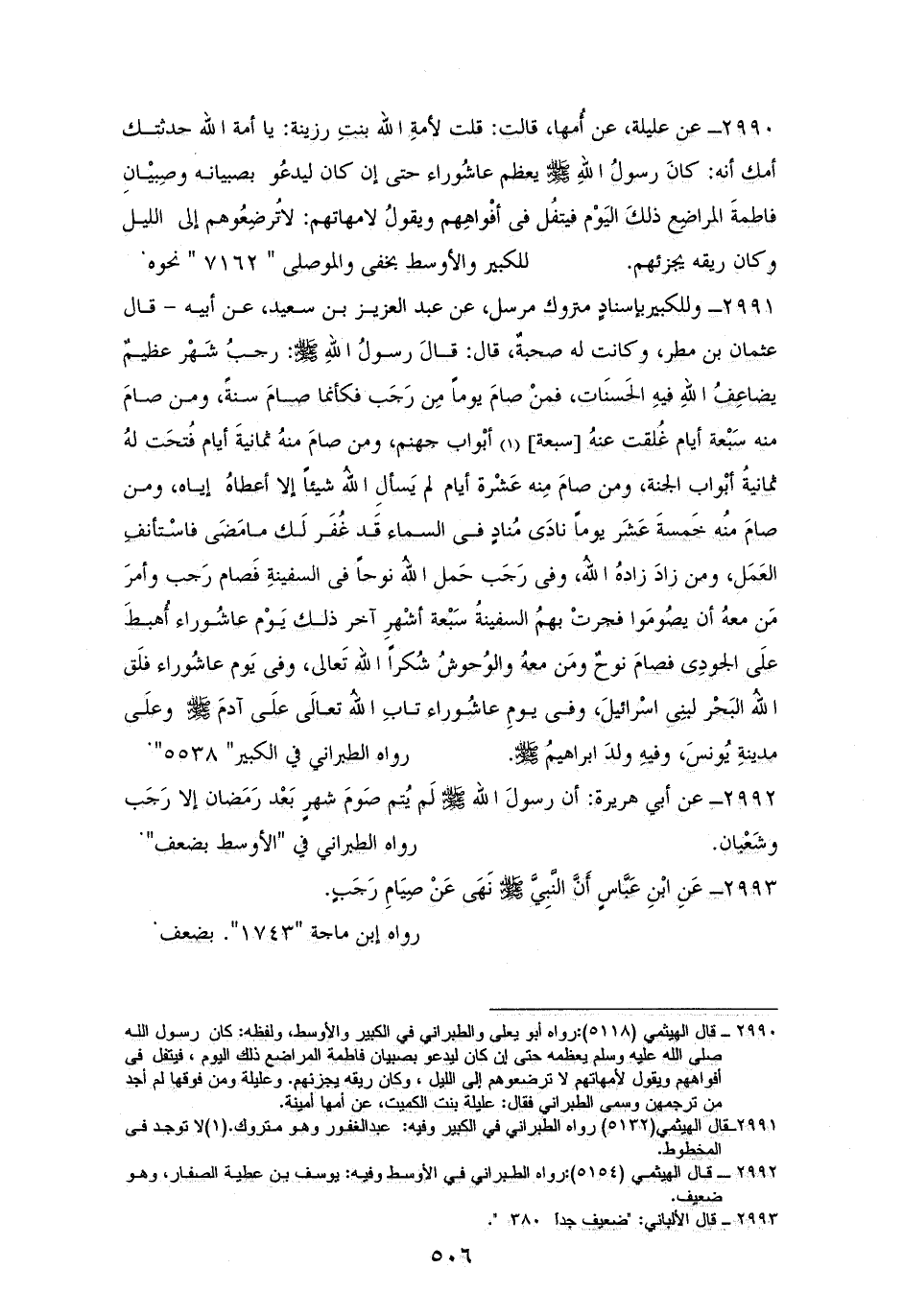 2991 - و ((للكبير)) بإسنادٍ متروك مرسل: قالَ رسولُ اللهِ - صلى الله عليه وسلم -: ((رجبُ شَهْرٌ عظيمٌ يضاعِفُ اللهُِ فيهِ الحَسنَاتِ، فمنْ صامَ يوماً مِن رَجَبَ فكأنَّما صامَ سنةً، ومن صامَ منه سَبْعةَ أيامٍ غُلِّقتْ عنهُ أبْوابُ جهنمَ، ومن صامَ منهُ ثمانيةَ أيامٍ فُتحَتْ لهُ ثمانيةُ أبْوابِ الجنةِ، ومن صامَ مِنه عَشْرةَ أيامٍ لم يَسألِ اللهَ شيئاً إلا أعطاهُ، ومن صامَ منُه خَمسةَ عَشَر يوماً نادَى مُنادٍ فى السماءِ قَد غُفَر لَك مامَضَى فاسْتأنفِ العَمَلَ، ومن زادَ زادهُ اللهُ، وفى رَجَب حَمل اللهُ نوحاً في السفينةِ، فَصام رَجب وأمرَ مَن معهُ أن يصُومُوه، فجرتْ بهمُ السفينةُ سَبْعة أشْهرِ آخر ذلك يَوْمُ عاشُوراء أُهبطَ علَى الجودِى، فصامَ نوحٌ ومَن معهُ والوحشُ شُكراً لله تَعالى، وفى يَومِ عاشُوراءَ أفلَقَ اللهُ البَحْر لبنِي إسْرائيلَ، وفى يومِ عاشُوراء تابِ اللهُ علَى آدمَ وعلَى مدينةِ يُونسَ، وفيهِ ولدَ إبراهيمُ)) (¬1).