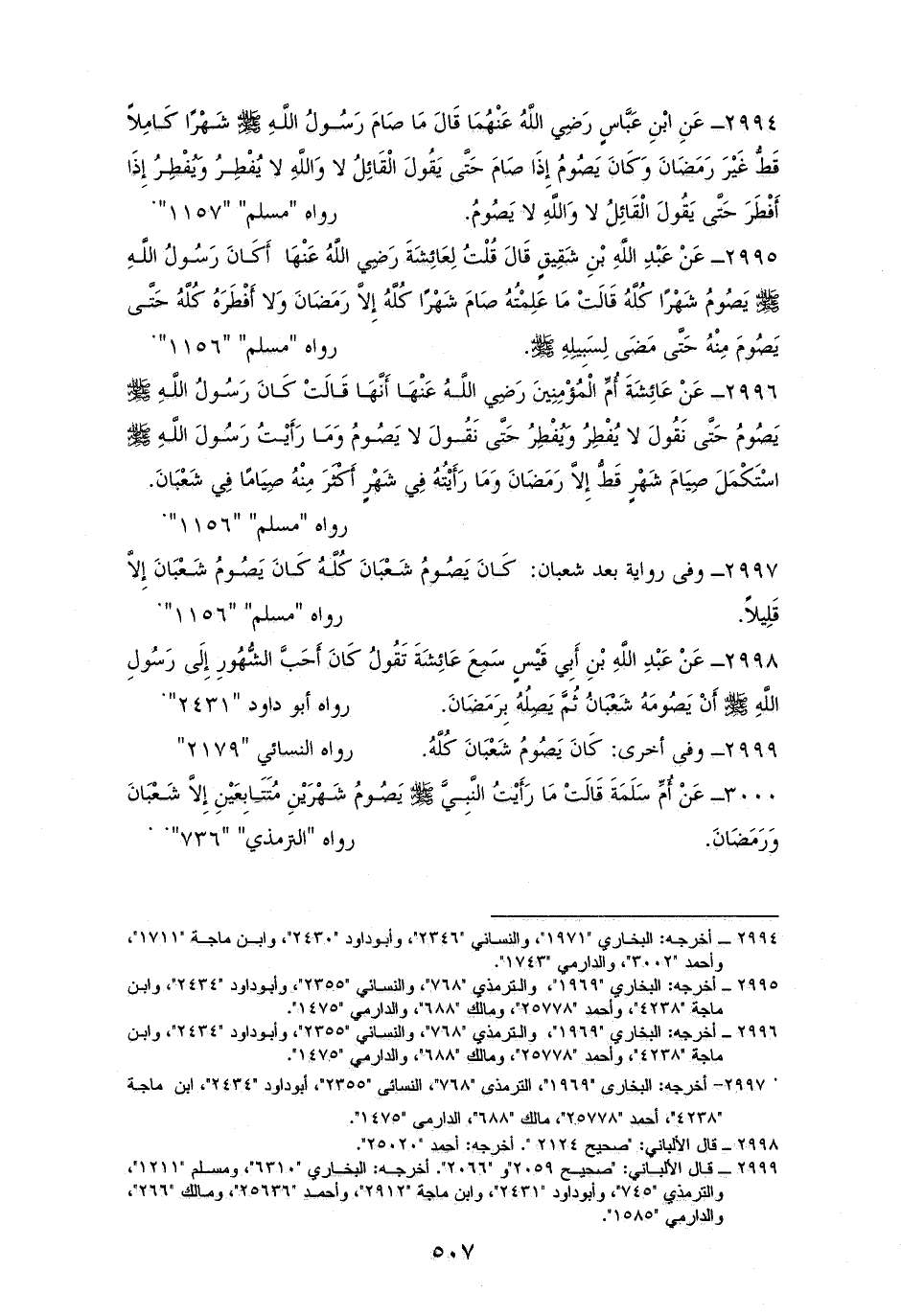 2995 - عَائِشَةُ: كَانَ رَسُولُ اللَّهِ - صلى الله عليه وسلم - يَصُومُ حتى نقول قد صام قد صام ويفطر حتى نقول: قد أفطر قد أفطر، ومَا عَلِمْتُهُ صَامَ شَهْرًا كُلَّهُ إِلاَّ رَمَضَانَ، وَلا أَفْطَرَهُ كُلَّهُ حَتَّى يَصُومَ مِنْهُ حَتَّى مَضَى لِسَبِيلِهِ. لمسلم والترمذيِّ والنسائيِّ (¬1).