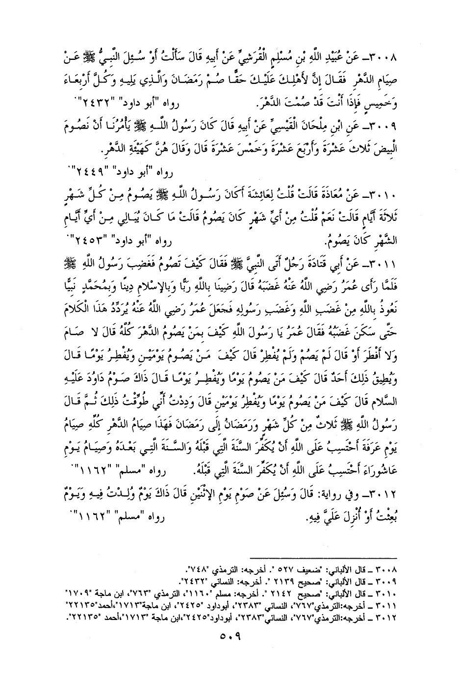 3008 - مُسْلِمُ الْقُرَشِي: سَأَلْتُ أَوْ سُئِلَ رسول الله - صلى الله عليه وسلم - عَنْ صِيَامِ الدَّهْرِ؟ فَقَالَ: ((إِنَّ لأَهْلِكَ عَلَيْكَ حَقًّا؛ فصُمْ رَمَضَانَ وَالَّذِي يَلِيهِ، وَكُلَّ أَرْبِعَاءَ وَخَمِيسٍ، فَإِذَا أَنْتَ قَدْ صُمْتَ الدَّهْرَ)). كله للترمذي وأبي داود (¬1).