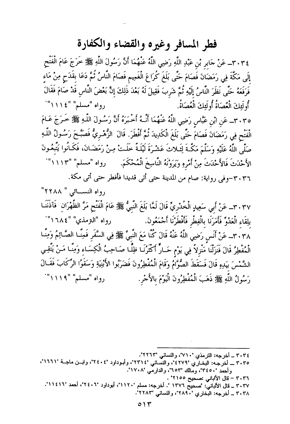 3035 - وللشيخين و ((الموطأ)) والنسائي، عن ابْنِ عَبَّاسٍ: صام رَسُولَ اللَّهِ - صلى الله عليه وسلم - حَتَّى إذا بَلَغَ الْكدِيدـ الماء الذي بين قُديد وعُسْفان ـ أفطر فلم يزل مفطرًا حتى انسلخ الشهر.