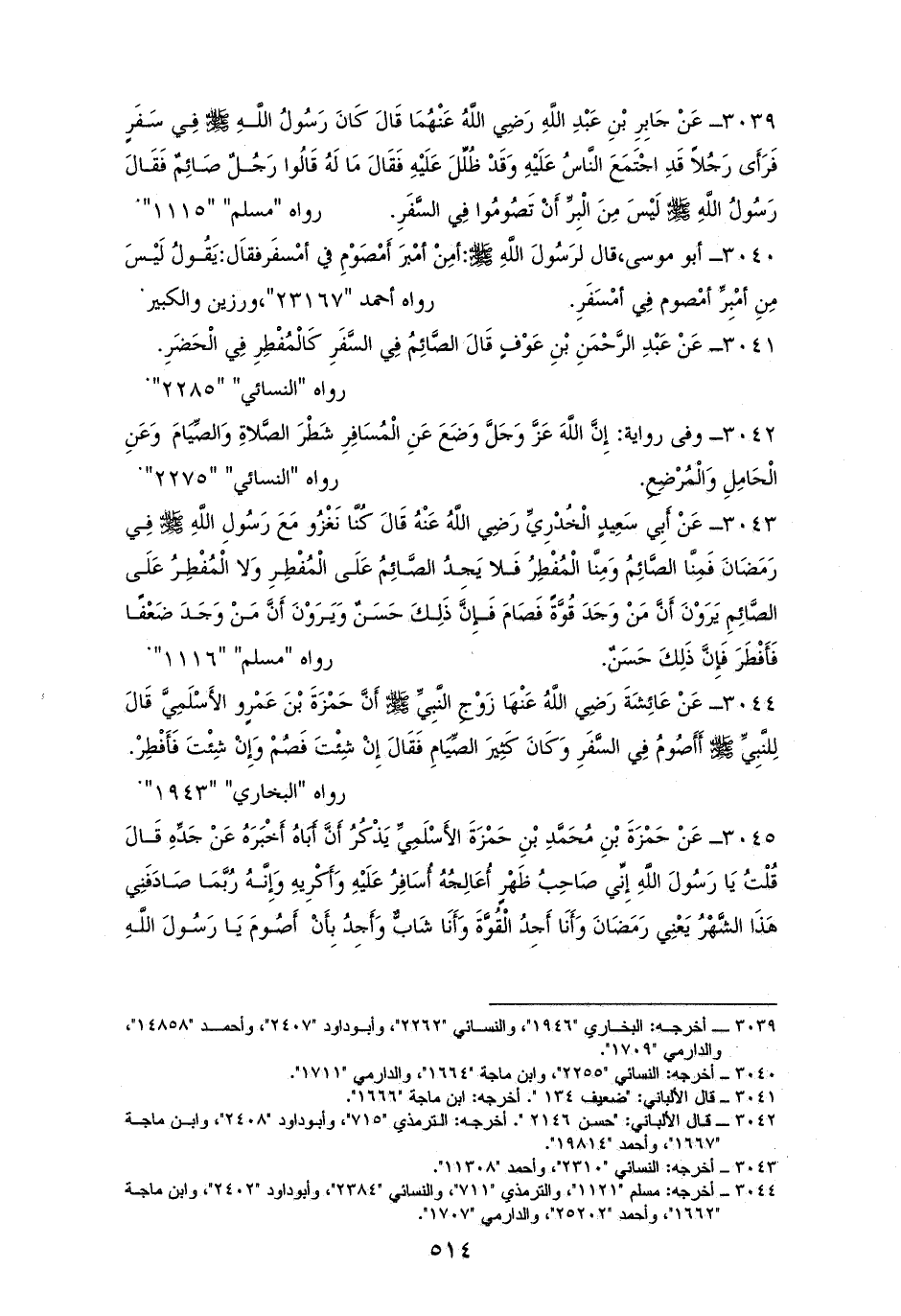 3041 - عَبْدُ الرَّحْمَنِ بْنُ عَوْفٍ قَالَ: الصَّائِمُ فِي السَّفَرِ كَالْمُفْطِرِ فِي الْحَضَرِ. للنسائي (¬1).