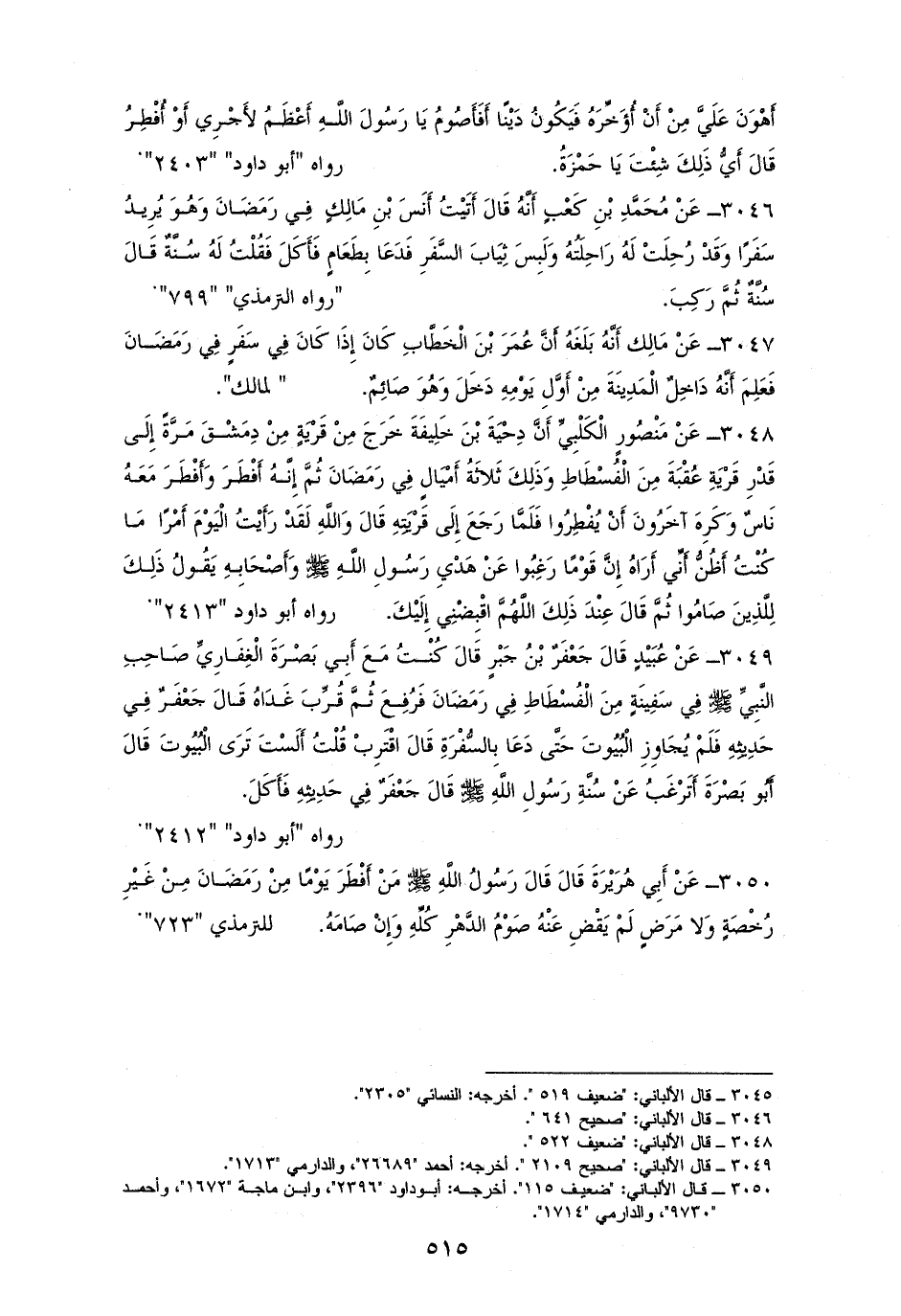 3046 - مُحَمَّدُ بْنُ كَعْبٍ: أَتَيْتُ أَنَسًا فِي رَمَضَانَ، وَهُوَ يُرِيدُ سَفَرًا، وَقَدْ رُحِلَتْ إليه رَاحِلَتُهُ وَلَبِسَ ثِيَابَ السَّفَرِ، فَدَعَا بِطَعَامٍ فَأَكَلَ، فَقُلْتُ لَهُ: سُنَّةٌ، فقَالَ: سُنَّةٌ ثُمَّ رَكِبَ. للترمذي (¬1).