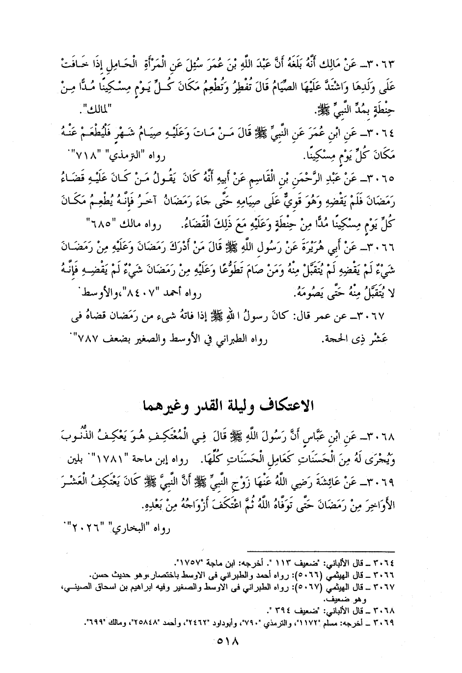3067 - عمرُ: كانَ رسولُ اللهِ - صلى الله عليه وسلم - إذا فاتهُ شيءٌ من رَمَضان قضاهُ في عَشْر ذِي الحجة. «للأوسط» و «الصغير» بضعف (¬1).