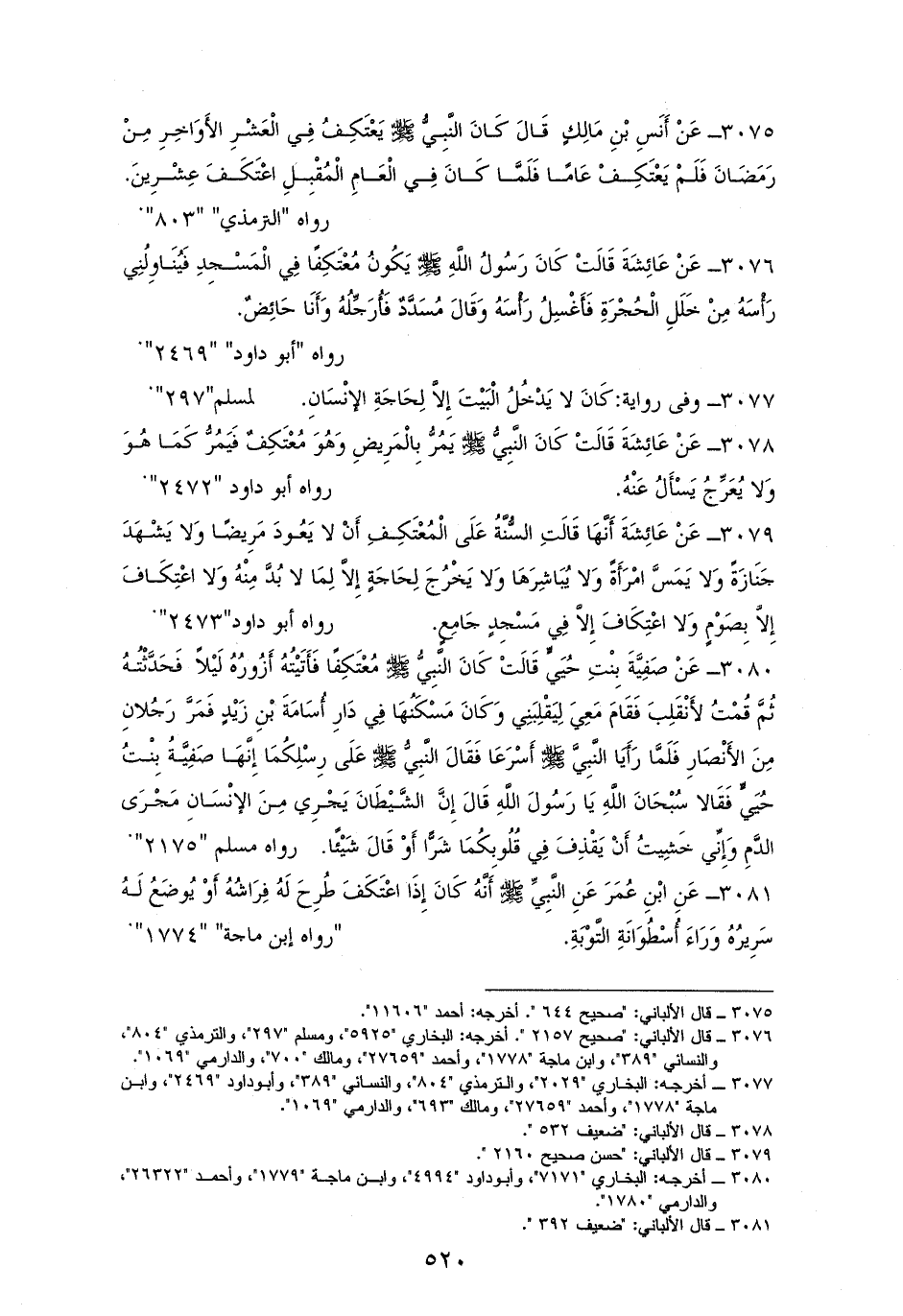 3075 - أَنَسُ: أن رسول الله - صلى الله عليه وسلم - كان يَعْتَكِفُ فِي الْعَشْرِ الأَوَاخِرِ مِنْ رَمَضَانَ، فَلَمْ يَعْتَكِفْ عَامًا، فَلَمَّا كَانَ من الْعَامِ الْمُقْبِلِ اعْتَكَفَ عِشْرِينَ. للترمذي (¬1).