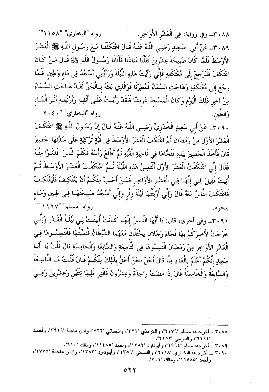 3091 - وفي أخرى قال: ((يَا أَيُّهَا النَّاسُ إِنَّهَا كَانَتْ أُبِينَتْ لِي لَيْلَةُ الْقَدْرِ التي خَرَجْتُ لأَخْبِرَكُمْ بِهَا، فَجَاءَ رَجُلانِ يَحْتَقَّانِ مَعَهُمَا الشَّيْطَانُ، فَنُسِّيتُهَا، فَالْتَمِسُوهَا فِي الْعَشْرِ الأَوَاخِرِ، الْتَمِسُوهَا فِي التَّاسِعَةِ وَالسَّابِعَةِ وَالْخَامِسَةِ)) قُلْتُ: يَا أَبَا سَعِيدٍ: إِنَّكُمْ بالعدد أَعْلَمُ مِنَّا، قَالَ: أَجَلْ، قَالَ: قُلْتُ: مَا التَّاسِعَةُ وَالسَّابِعَةُ وَالْخَامِسَةُ؟ قَالَ: إِذَا مَضَتْ وَاحِدَةٌ وَعِشْرُونَ فَالَّتِي تَلِيهَا، ثنتان وَعِشْرِون فهِيَ
