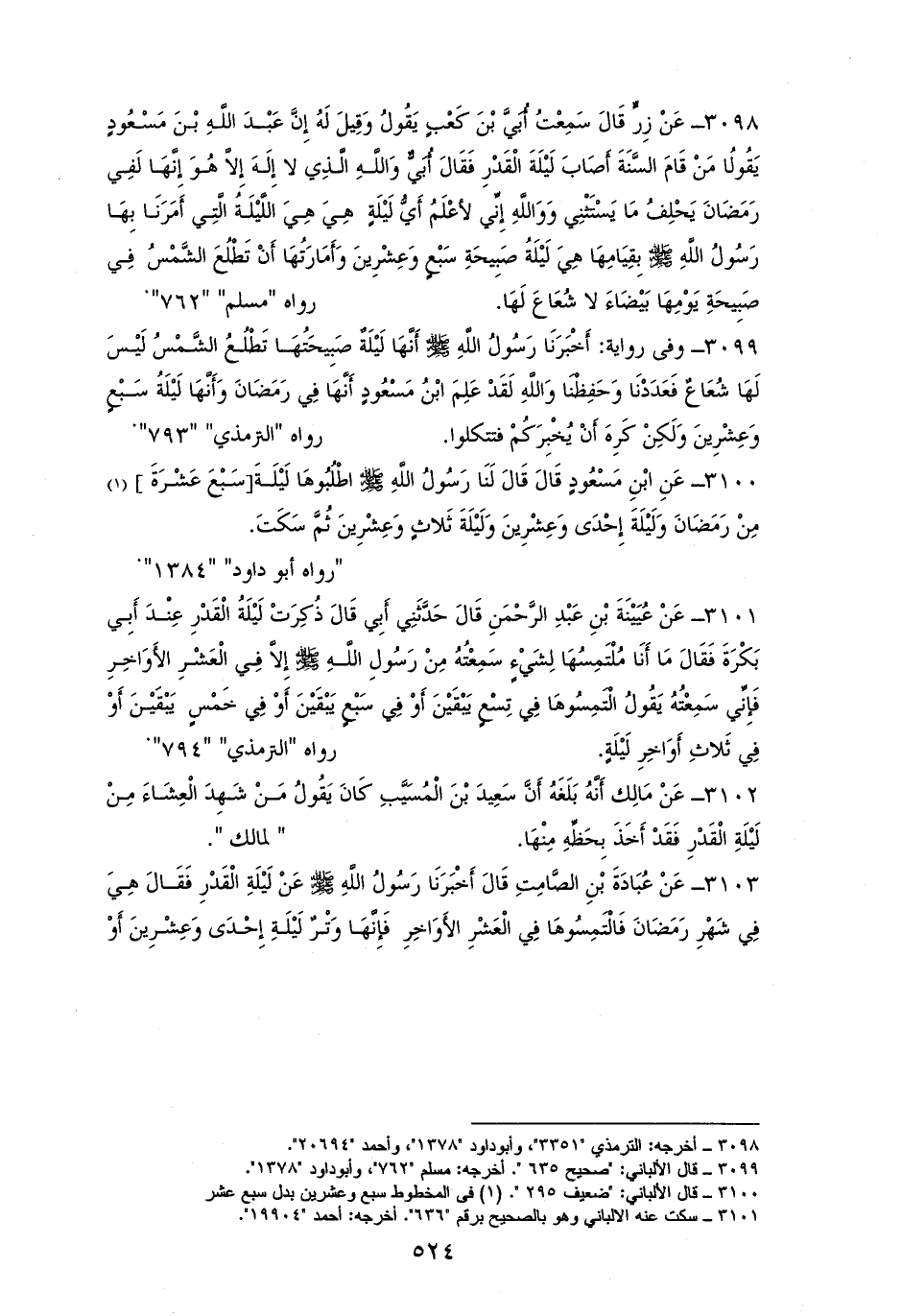 3100 - ابْنُ مَسْعُودٍ: قَالَ لَنَا رَسُولُ اللَّهِ - صلى الله عليه وسلم - في ليلة القدر: ((اطْلُبُوهَا في لَيْلَة [سَبْعَ وعَشْرين] مِنْ رَمَضَانَ، وَلَيْلَة إِحْدَى وَعِشْرِينَ، وَلَيْلَة ثَلاثٍ وَعِشْرِينَ)) ثُمَّ سَكَتَ. أبو داود (¬1).