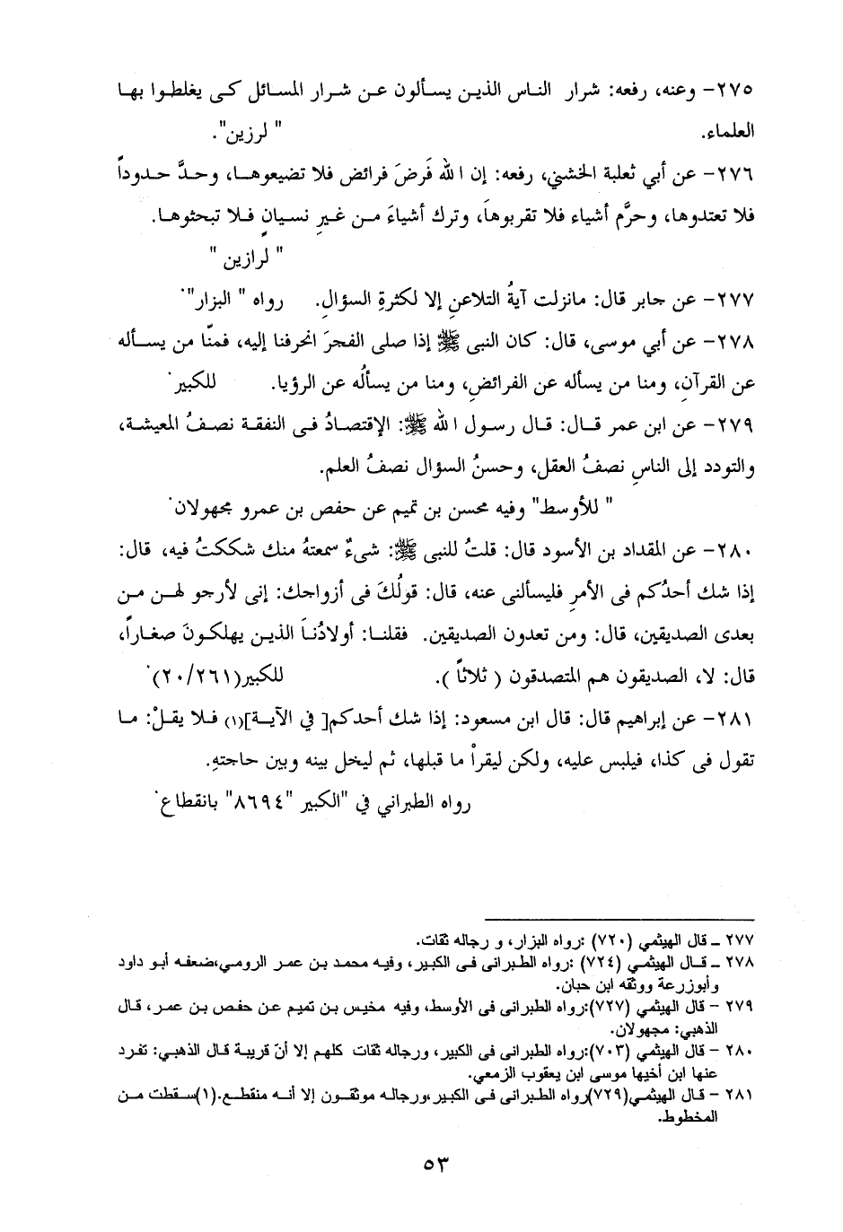 280 - المقداد بن الأسود: قلتُ للنبي - صلى الله عليه وسلم -: شيىءٌ سمعتهُ منك شككتُ فيه، قال: ((إذا شك أحدُكم في الأمرِ فليسألني عنه))، قال: قولُكَ في أزواجك: إنى لأرجو لهن من بعدى الصديقين، قال: ((ومن تعدون الصديقين؟)). قلنا: أولادُناَ الذين يهلكونَ صغارًا، قال: ((لا، الصديقون هم المتصدقون)) ثلاثًا. للكبير (¬1)