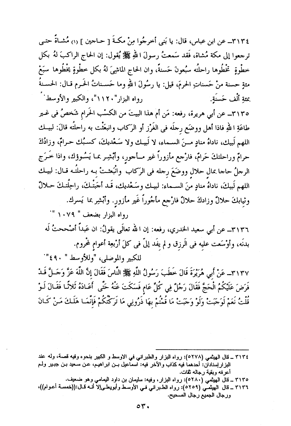 3134 - ابنُ عباس، قال: يا بَنى أخرجُوا مِنْ مكةَ حاجين مُشاةً حتى ترجعوا إلي مكة مُشاة، فَقد سَمعتُ رسولَ اللهِ - صلى الله عليه وسلم - يُقول: ((إن الحاج الراكبَ لهُ بكل خطْوةٍ تخْطُوها راحلتُه سبُعونَ حَسنةً، وان الحاج الماشِىَ لهُ بكل خطْوةٍ يخْطُوها سبَعْمائه حسنة منْ حَسناتِ الحرمَ)) قيل: يا رسُولَ اللهِ وما حَسناتُ الحَرم؟ قال: ((الحسنةُ بمائة ألْف حَسنَةٍ)). البزار و «الكبير» و «الأوسط» (¬1).