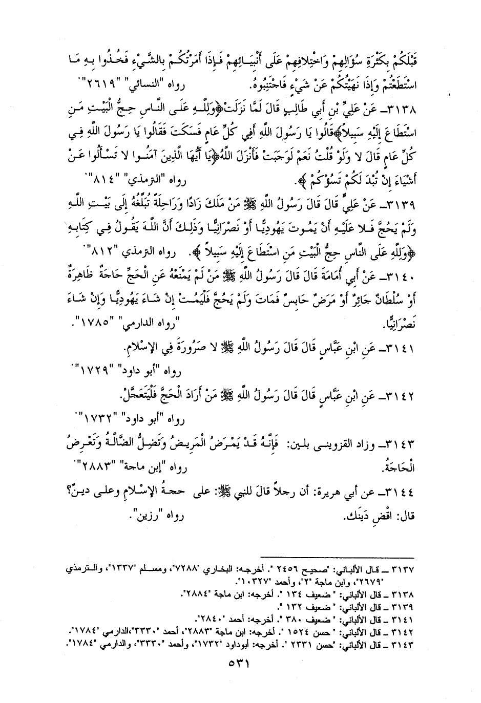 3139 - وعنه رفعه: ((مَنْ مَلَكَ رَاحِلَةً وزادًا يبَلِّغُهُ إِلَى بَيْتِ اللَّهِ الحرام، وَلَمْ يَحُجَّ فَلا عَلَيْهِ أَنْ يَمُوتَ يَهُودِيًّا أَوْ نَصْرَانِيًّا وَذَلِكَ أَنَّ اللَّهَ تعالى يَقُولُ: {وَلِلَّهِ عَلَى النَّاسِ حِجُّ الْبَيْتِ مَنِ اسْتَطَاعَ إِلَيْهِ سَبِيلاً})). هما للترمذي (¬1).