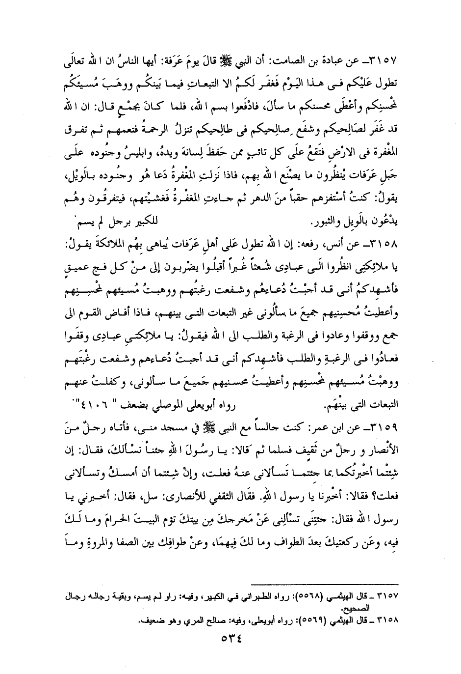 3158 - أنس رفعه: ((إن الله تطول عَلى أهلِ عَرَفات يُباهي بِهُم الملائكةَ يقولُ: يا ملائِكتِي انظُروا إلَى عبادِي شُعثاً غُبراً أقبلُوا يضْربون إليَّ منْ كل فج عميقٍ فأشهِدكمُ أني قد أجبْتُ دُعاءهُم، وشفعت رغبتهم ووهبتُ مُسيئهم لمحْسِنِهم، وأعطيتُ مُحسِنيهم جميعَ ما يسألُونى غير التبعات التى بينهم، فإذا أفاض القوم إلى جمع ووقفوا وعادوا في الرغبة والطلب الى الله فيقولُ: يا ملائِكتي عبادِي وقفوا فعادُوا في الرغبةِ والطلب فأشهِدكم أني قد أجبتُ دُعاءهم وشفعت رغْبتَهم ووهبْتُ مُسيئهم لمحْسنِهم وأعطيتُ محسنيهم جَميعَ ما سألوني، وتكفلتُ عنهم التبعات التى بينْهَم)). للموصلي بضعف (¬1).