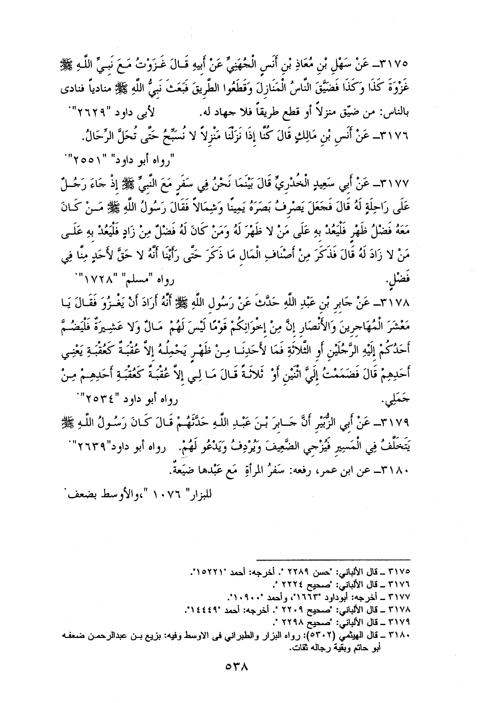 3180 - عن ابن عمر رفعه: ((سَفرُ المرأةِ مَع عَبْدها ضيَعةٌ)). للبزار، و ((الأوسط)) بضعف (¬1).