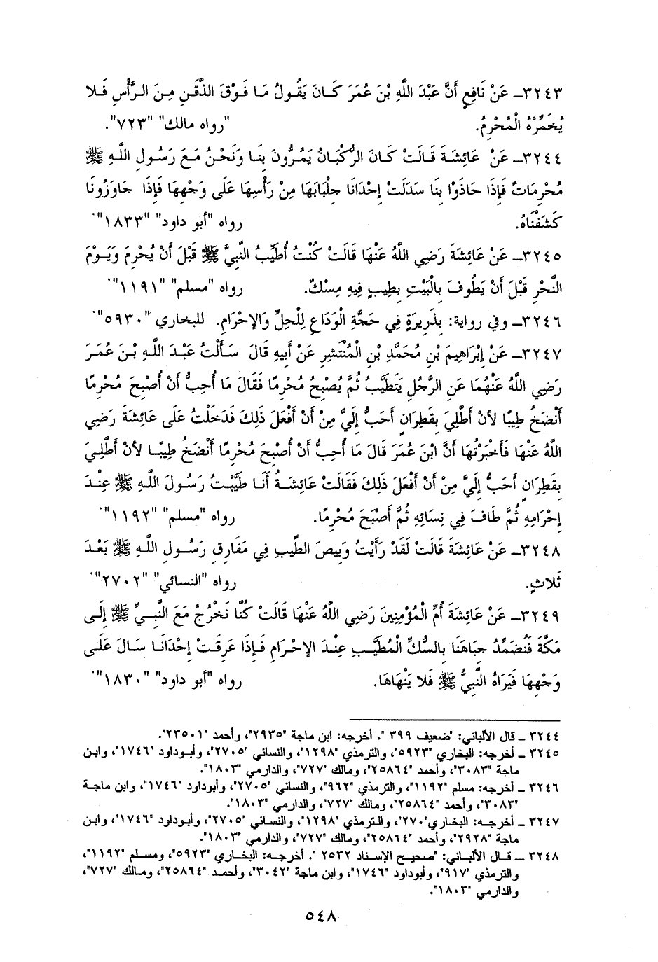 3245 - وعنها: كُنْتُ أُطَيِّبُ النَّبِيَّ - صلى الله عليه وسلم - قَبْلَ أَنْ يُحْرِمَ وَيَوْمَ النَّحْرِ قَبْلَ أَنْ يَطُوفَ بِالْبَيْتِ بِطِيبٍ فِيهِ مِسْكٌ. للستة (¬1).
