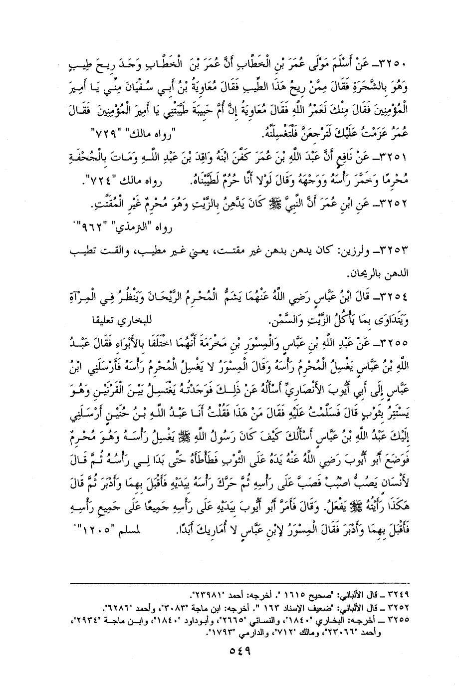3252 - وعنه أَنَّ رسول الله - صلى الله عليه وسلم - كَانَ يَدَّهِنُ بِالزَّيْتِ وَهُوَ مُحْرِمٌ غَيْرِ الْمُقَتَّتِ. للترمذي (¬1).