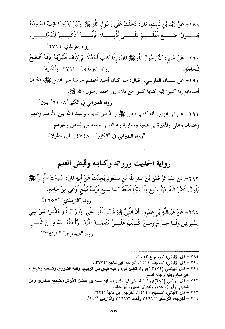 290 - جَابِرٍ رفعه: ((إِذَا كَتَبَ أَحَدُكُمْ كِتَابًا فَلْيُتَرِّبْهُ فَإِنَّهُ أَنْجَحُ لِلْحَاجَةِ)). للترمذي وأنكره (¬1).
