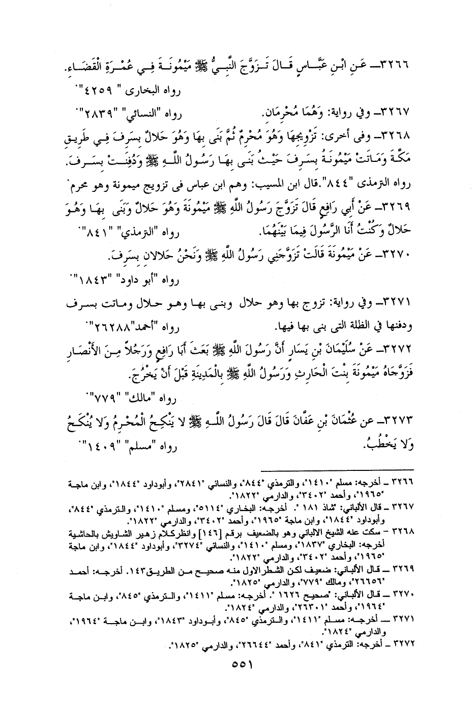 3270 - مَيْمُونَةَ: تَزَوَّجَنِي رَسُولُ الله - صلى الله عليه وسلم - وَنَحْنُ حَلال بِسَرِفَ. لمسلم، وأبي أبو داود، والترمذي (¬1).