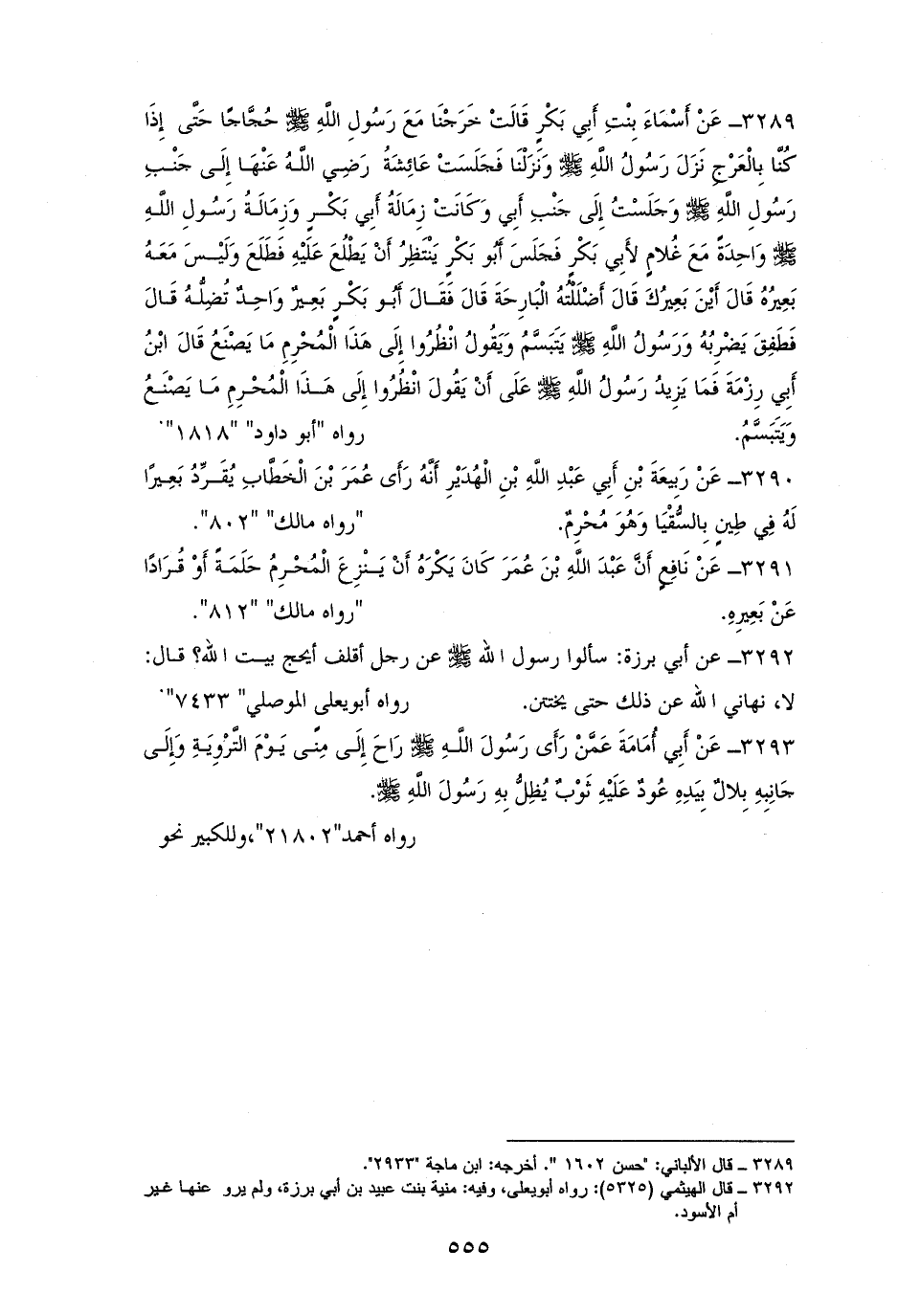 3289 - أَسْمَاء بِنْتِ أَبِي بَكْرٍ: خَرَجْنَا مَعَ رَسُولِ الله - صلى الله عليه وسلم - حُجَّاجًا حَتَّى إِذَا كُنَّا بِالْعَرْجِ نَزَلَ رَسُولُ الله - صلى الله عليه وسلم - وَنَزَلْنَا، وجَلَسَتْ عَائِشَةُ إِلَى جَنْبِ رَسُولِ الله - صلى الله عليه وسلم - وَجَلَسْتُ إِلَى جَنْبِ أَبِي، وَكَانَ زِمَالَةُ رَسُولِ الله - صلى الله عليه وسلم - وزِمَالَةُ أَبِي بَكْرٍ، وَاحِدَةً مَعَ غُلامٍ لأَبِي بَكْرٍ، فَجَلَسَ أَبُو بَكْرٍ يَنْتَظِرُ أَنْ يَطْلُعَ عَلَيْهِ، فَطَلَعَ عليه وَلَيْسَ مَعَهُ بَعِيرُهُ، فقال له أبو بكر: أَيْنَ بَعِيرُكَ؟ قَالَ: أَضْلَلْتُهُ الْبَارِحَةَ. قَالَ أَبُو بَكْرٍ: بَعِيرٌ وَاحِدٌ تُضِلُّهُ، وَطَفِقَ يَضْرِبُهُ وَرَسُولُ الله - صلى الله عليه وسلم - يَتَبَسَّمُ وَيَقُولُ: ((انْظُرُوا إِلَى هَذَا الْمُحْرِمِ مَا يَصْنَعُ)) وما يزيد على ذلك وَيَتَبَسَّمُ. لأبي داود (¬1).