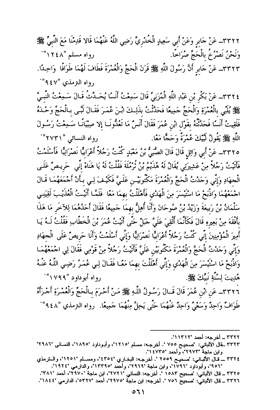 3323 - جَابِر: أَنَّ النبي - صلى الله عليه وسلم - قَرَنَ الْحَجَّ وَالْعُمْرَةَ فَطَافَ لَهُمَا طَوَافًا وَاحِدًا. للترمذي والنسائي. (¬1)