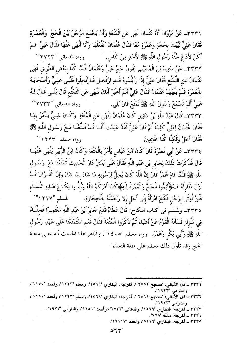 3335 - قال الحميدي: ولمسلم في كتاب النكاح: قَدِمَ جَابِرُ فَجِئْنَاهُ فِي مَنْزِلِهِ، فَسَأَلَهُ الْقَوْمُ عَنْ أَشْيَاءَ، ثُمَّ ذَكَرُوا الْمُتْعَةَ، قَالَ: اسْتَمْتَعْنَا مع رَسُولِ الله - صلى الله عليه وسلم - وَأَبِي بَكْرٍ وَعُمَرَ. وظاهر هذا الحديث أنه عنى متعة الحج، وقد تأول مسلم ذلك على متعة النساء (¬1).